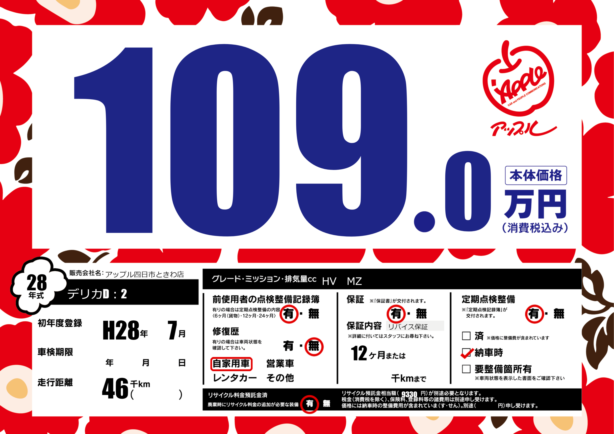 | 車名 | デリカD:2 | グレード ミッション 排気量 |
