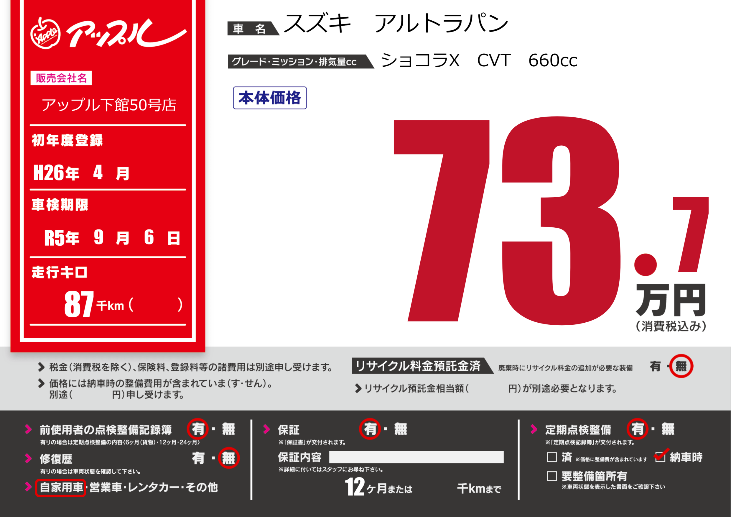 | 定期点検整備 | 定期点検整備あり 納車時あり | ||