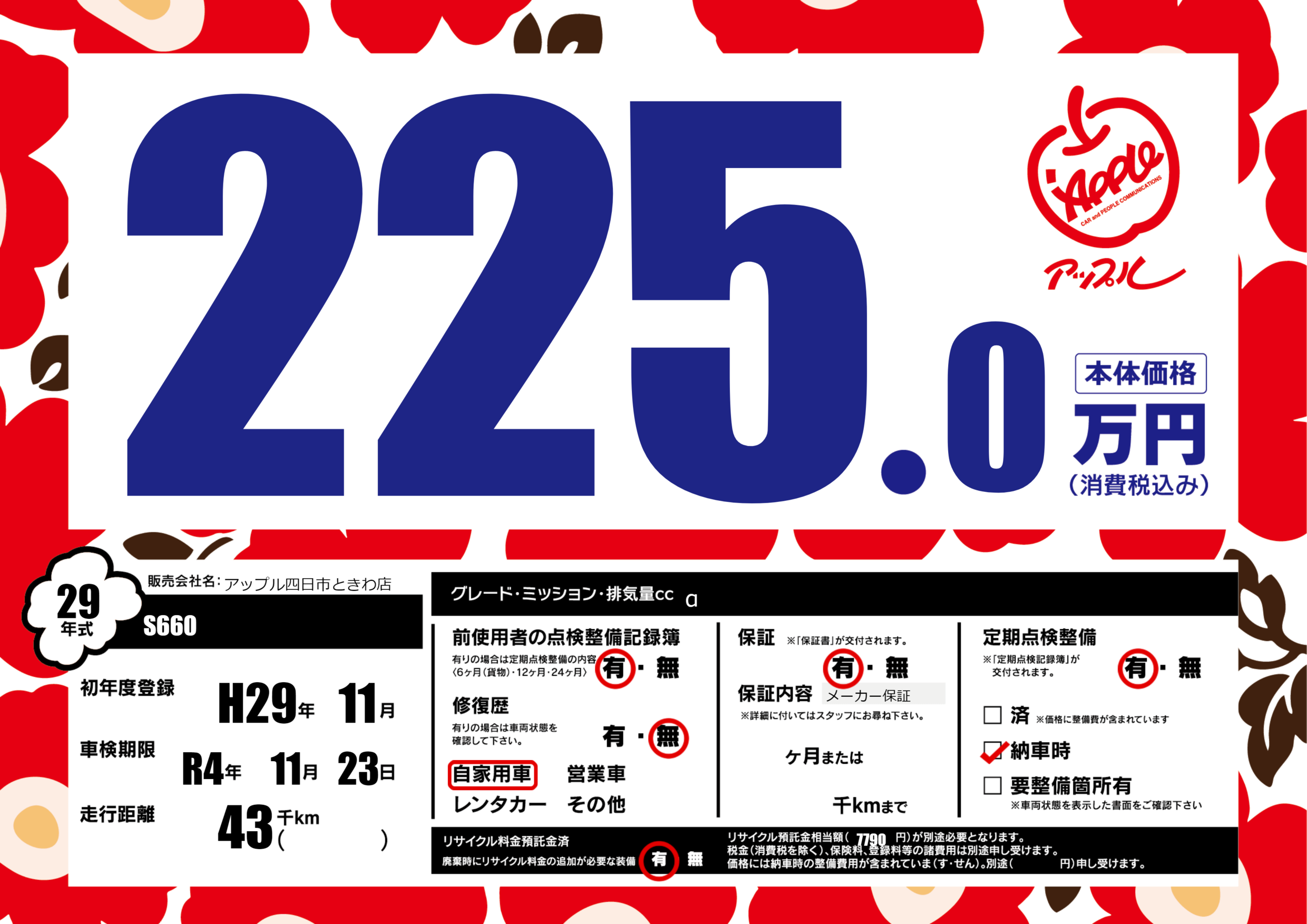 | 走行キロ | 4.3万km | 初年度登録 | H29年11月 |