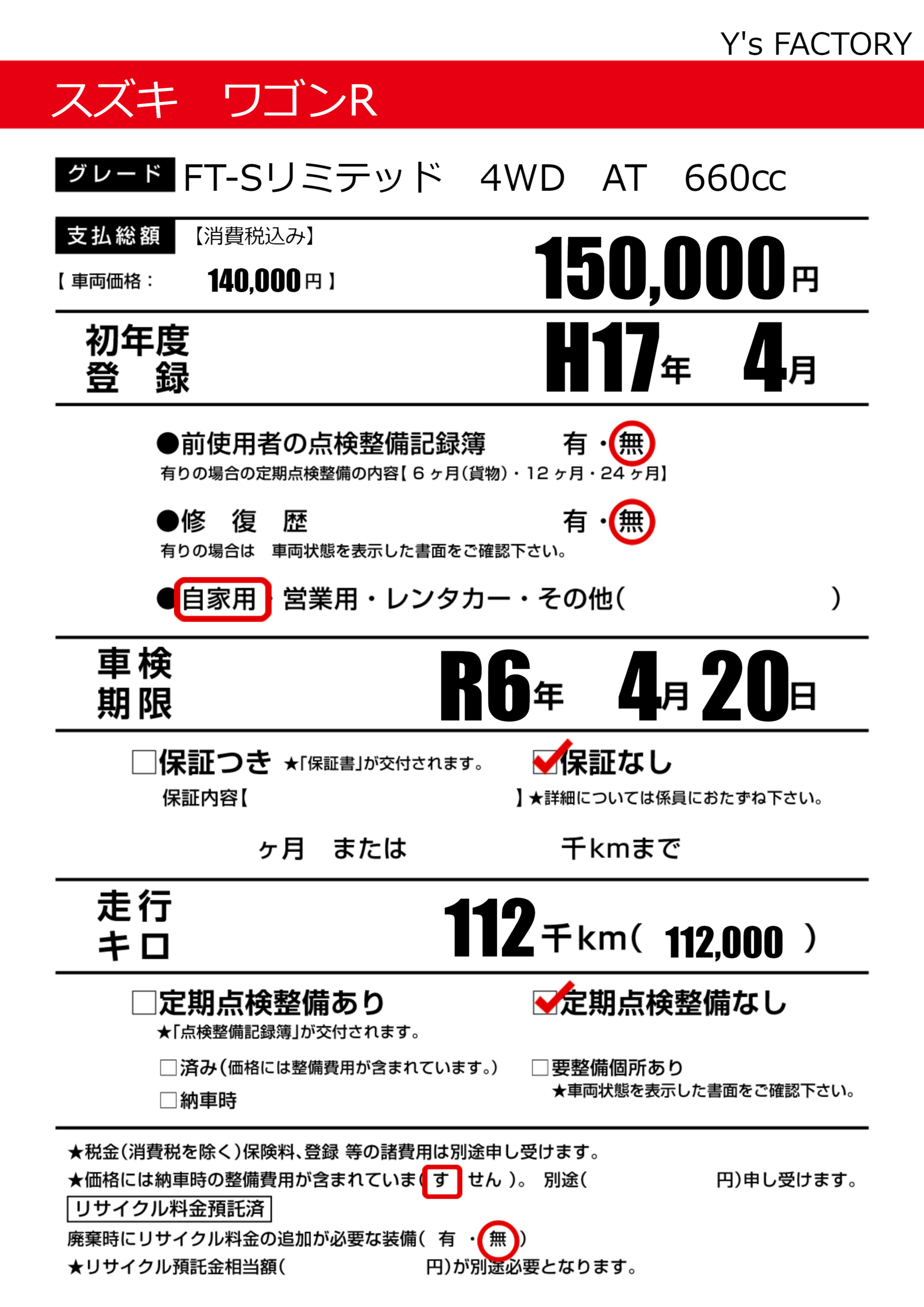 | 車名 | スズキ ワゴンR | グレード ミッション 排気量 |
