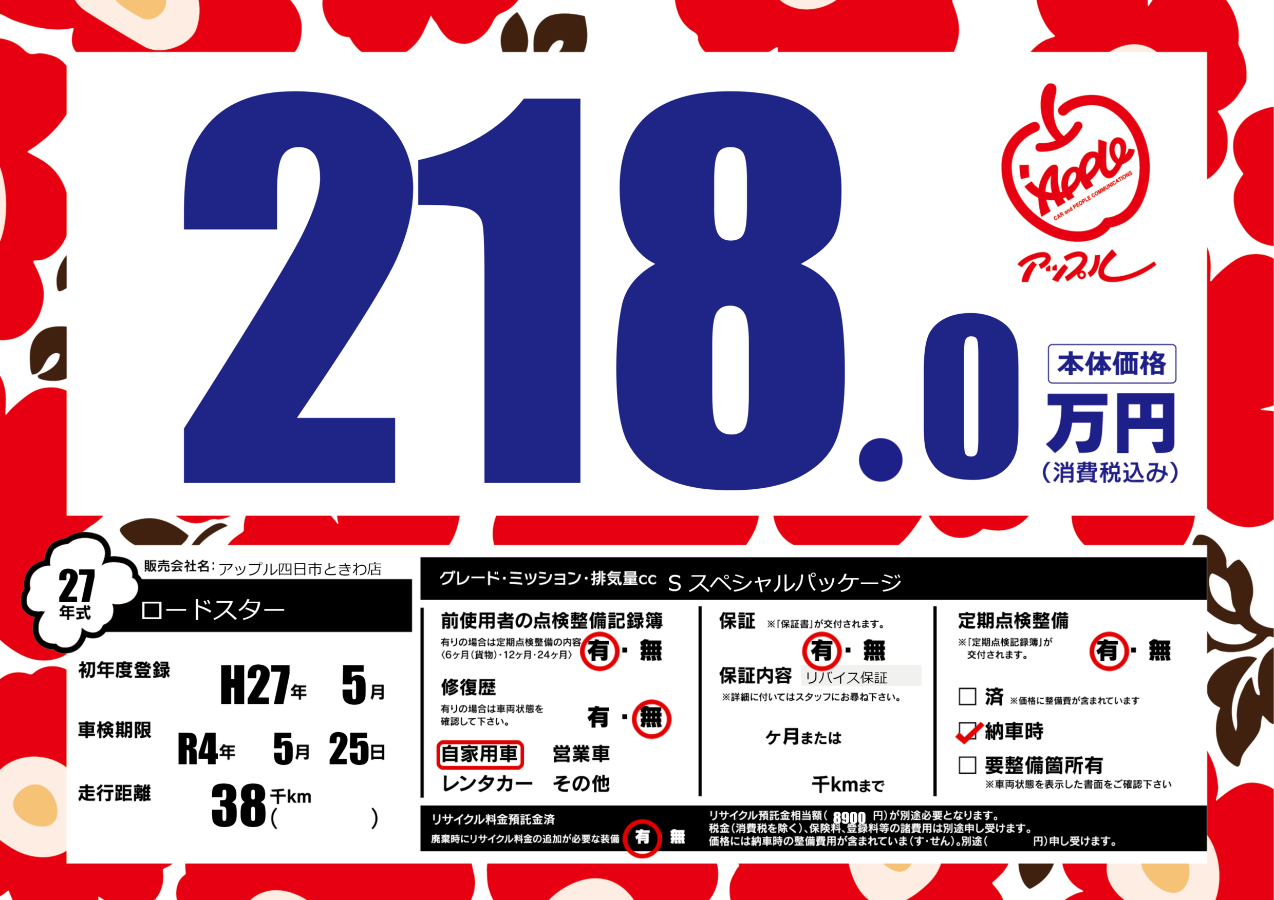 | 車名 | ロードスター | グレード ミッション 排気量 |