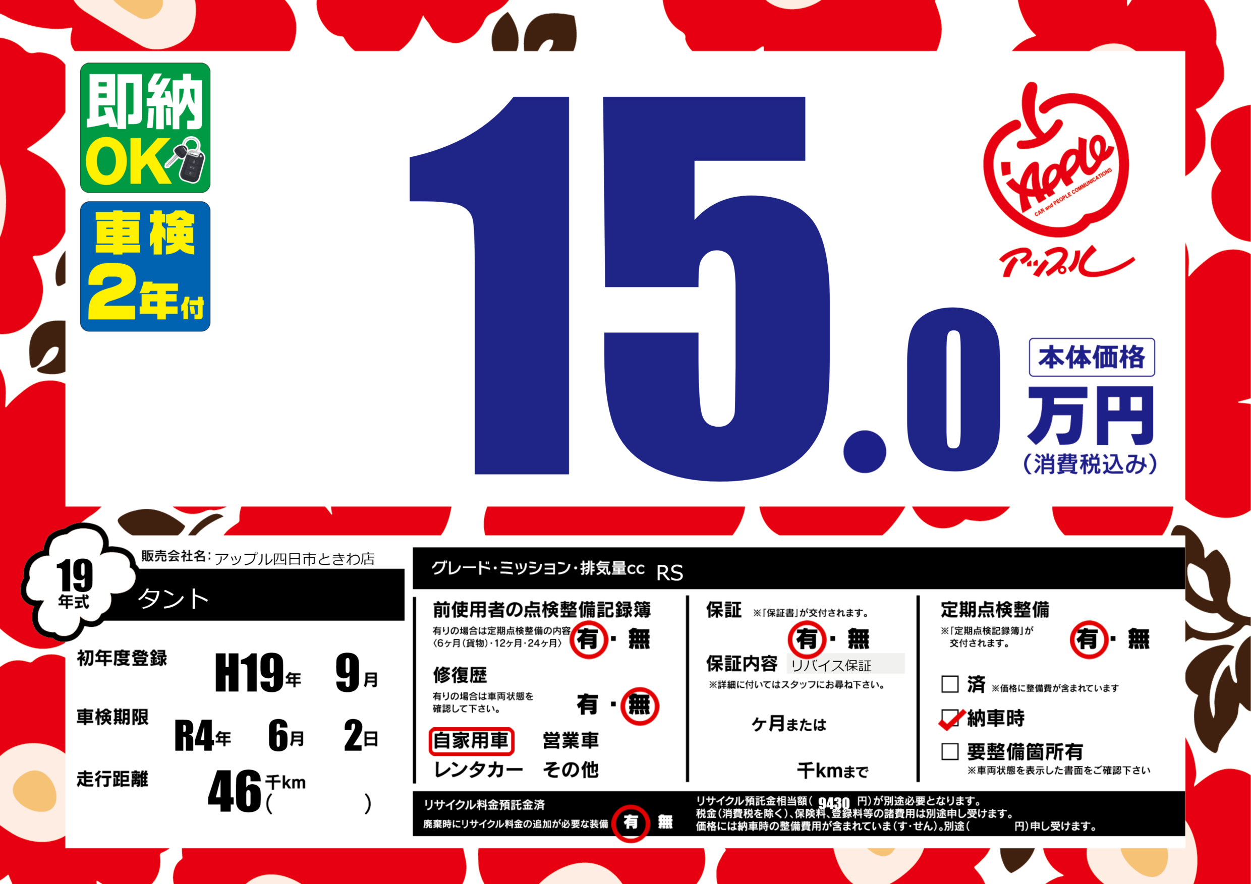 | 走行キロ | 4.6万km | 初年度登録 | H19年9月 |