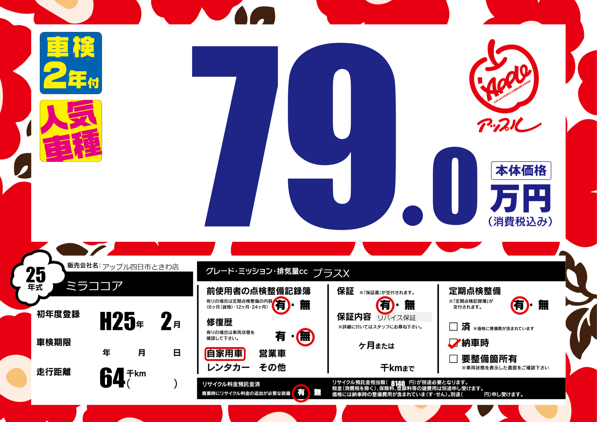 | 車名 | ミラココア | グレード ミッション 排気量 |