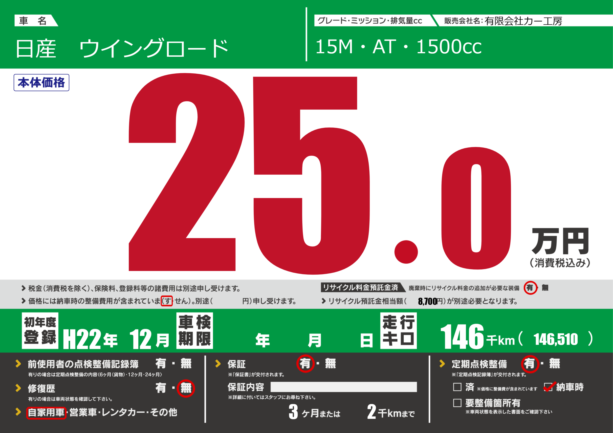 | 車名 | 日産 ウイングロード | グレード ミッション 排気量 |