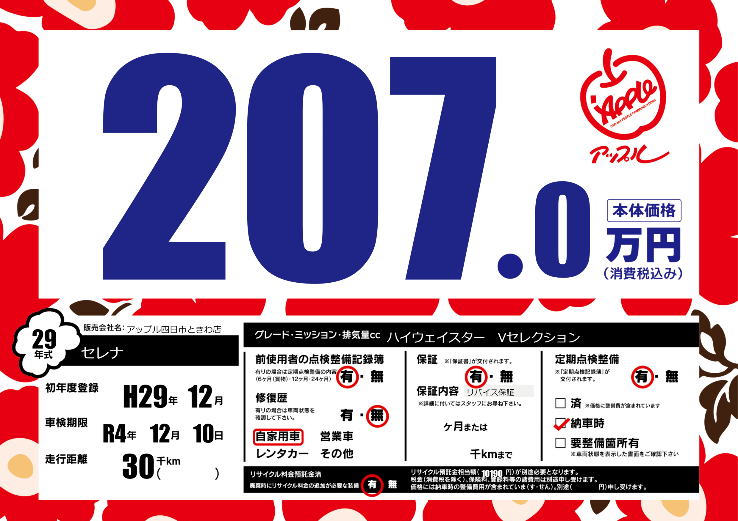 | 走行キロ | 3万km | 初年度登録 | H29年12月 |