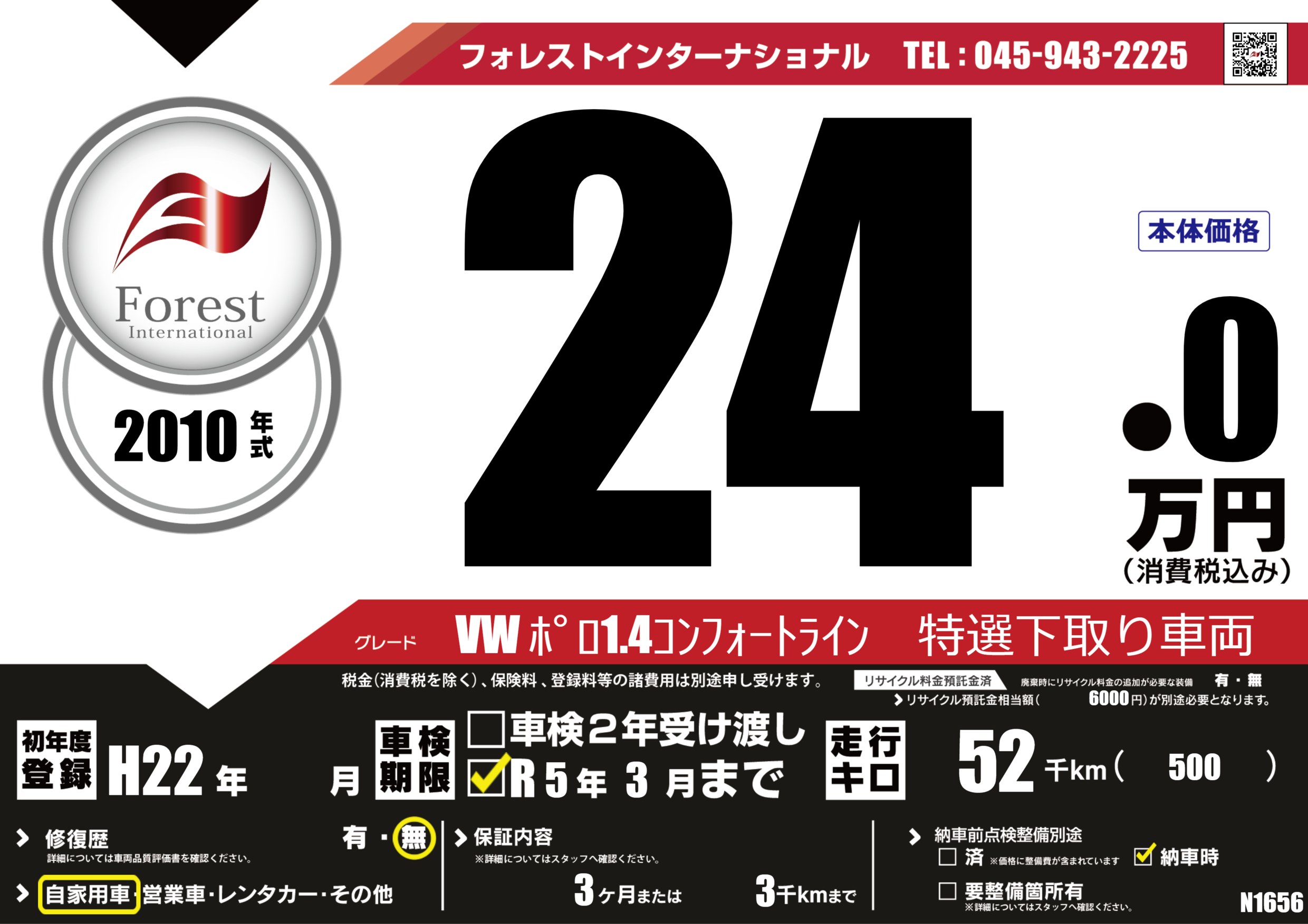 VW ポロ1.4コンフォートライン 特選下取り車両 |