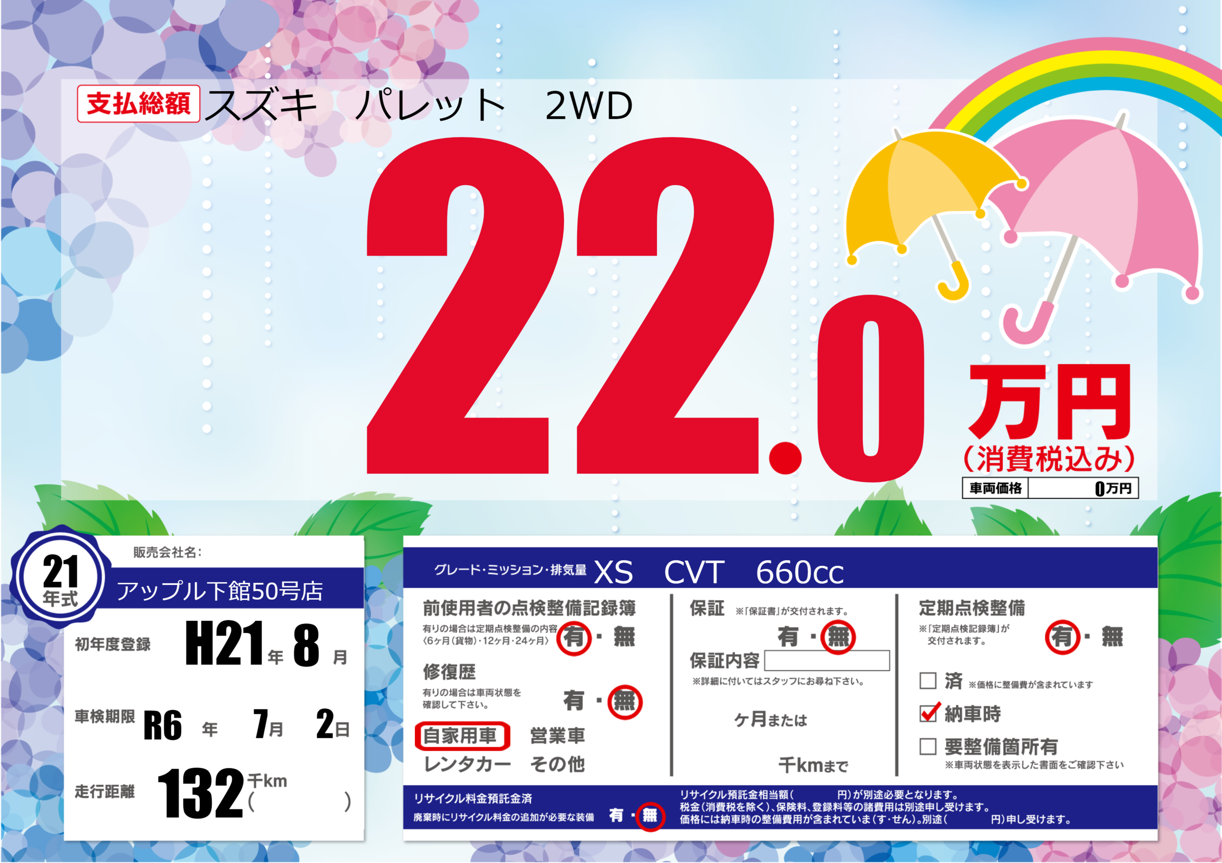 | 車名 | スズキ パレット 2WD | グレード ミッション 排気量 |