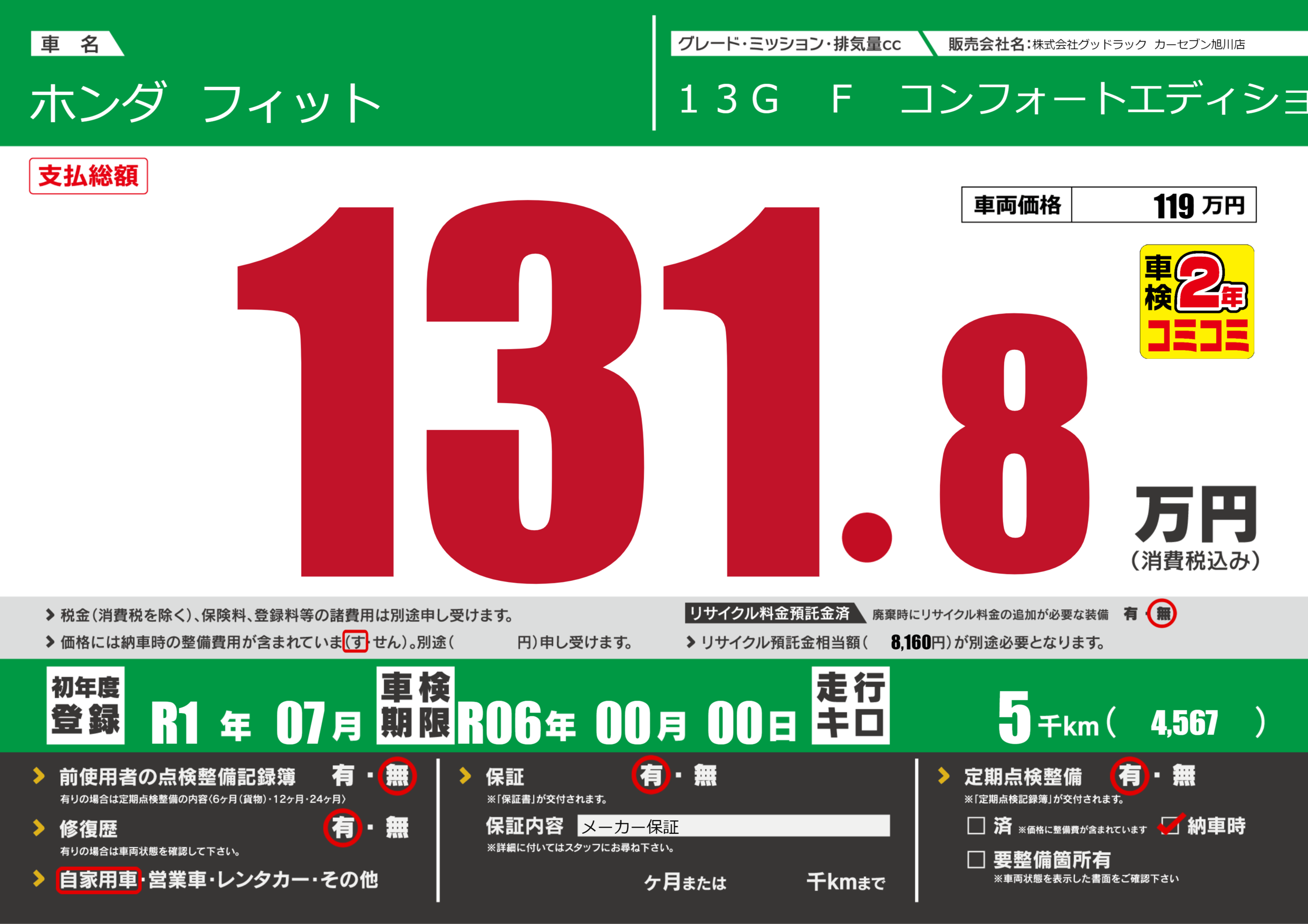 | 車名 | ホンダ フィット | グレード ミッション 排気量 |
