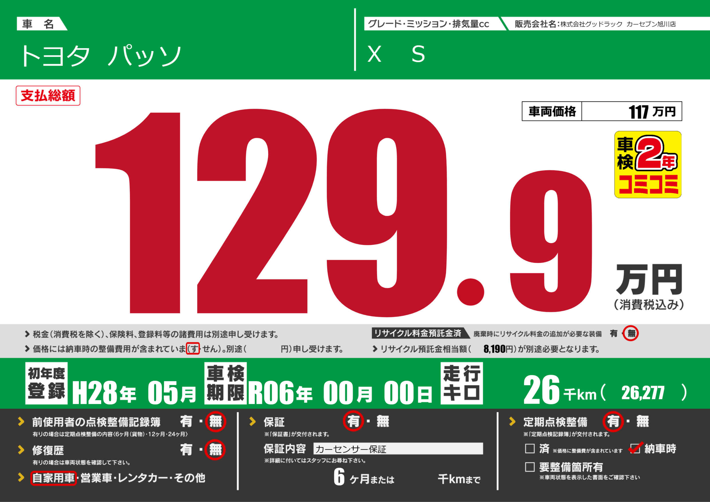 | 車名 | トヨタ パッソ | グレード ミッション 排気量 |