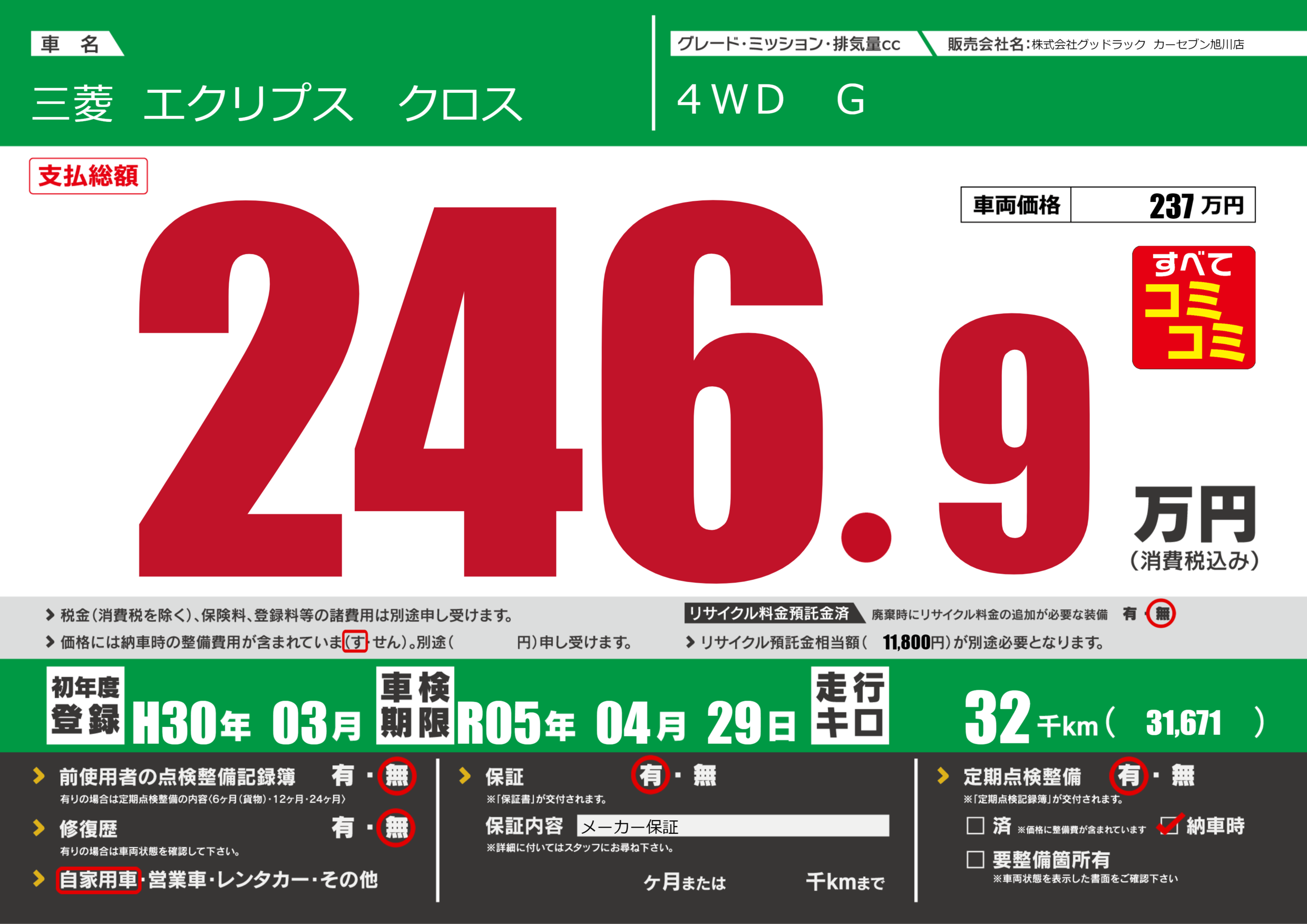 | 車名 | 三菱 エクリプス クロス | グレード ミッション 排気量 |
