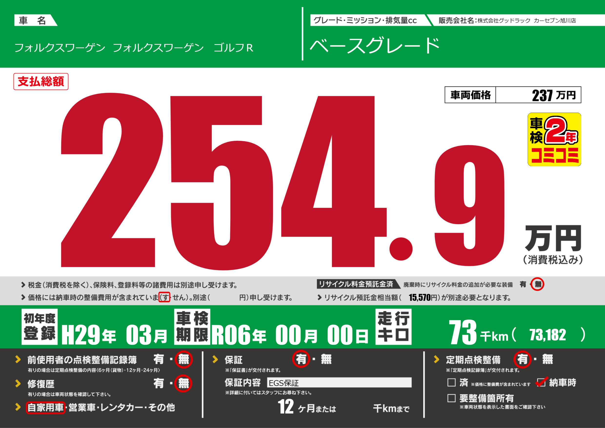 | 車名 | フォルクスワーゲン フォルクスワーゲン ゴルフR | グレード ミッション 排気量 |