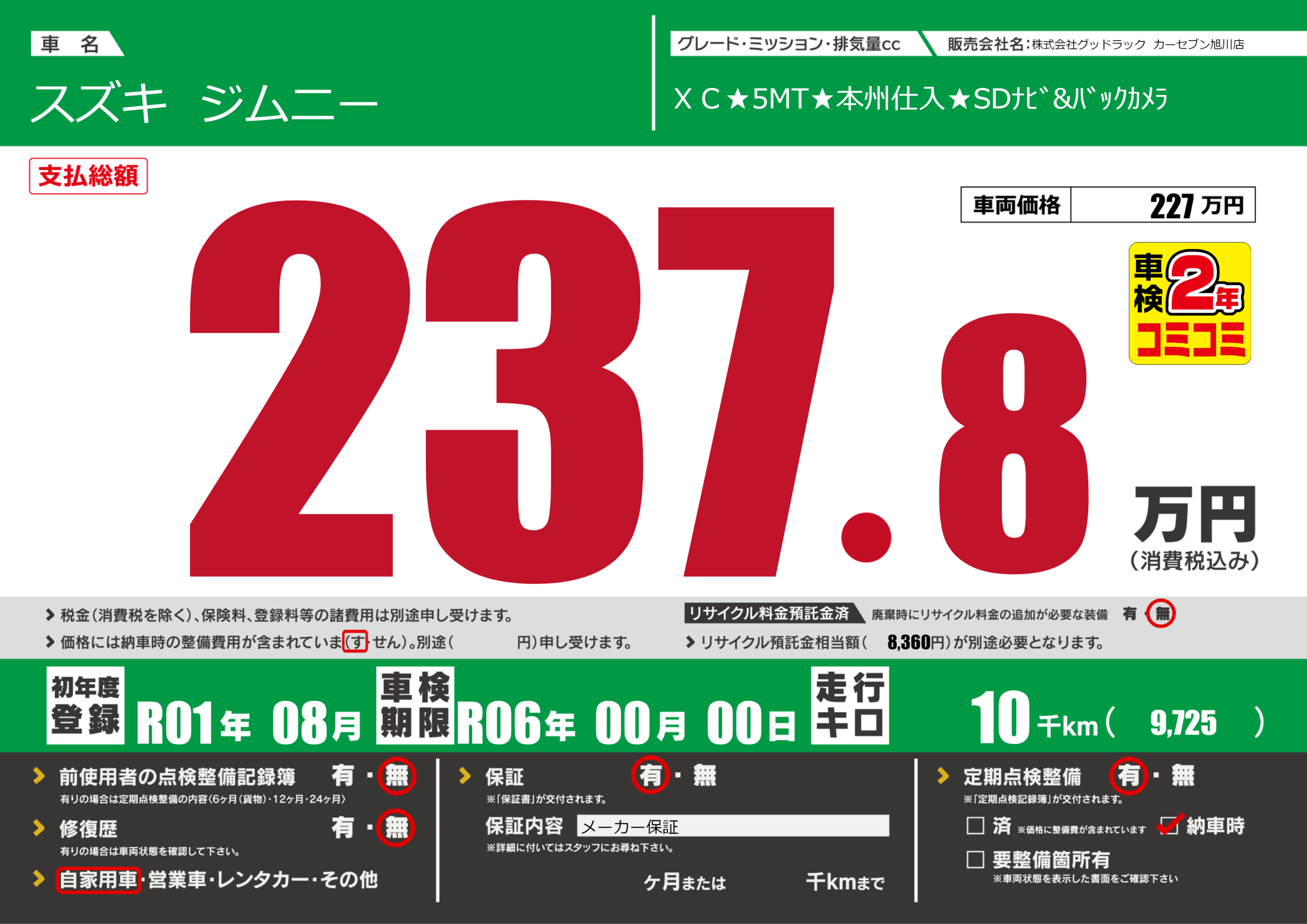 | 車名 | スズキ ジムニー | グレード ミッション 排気量 |