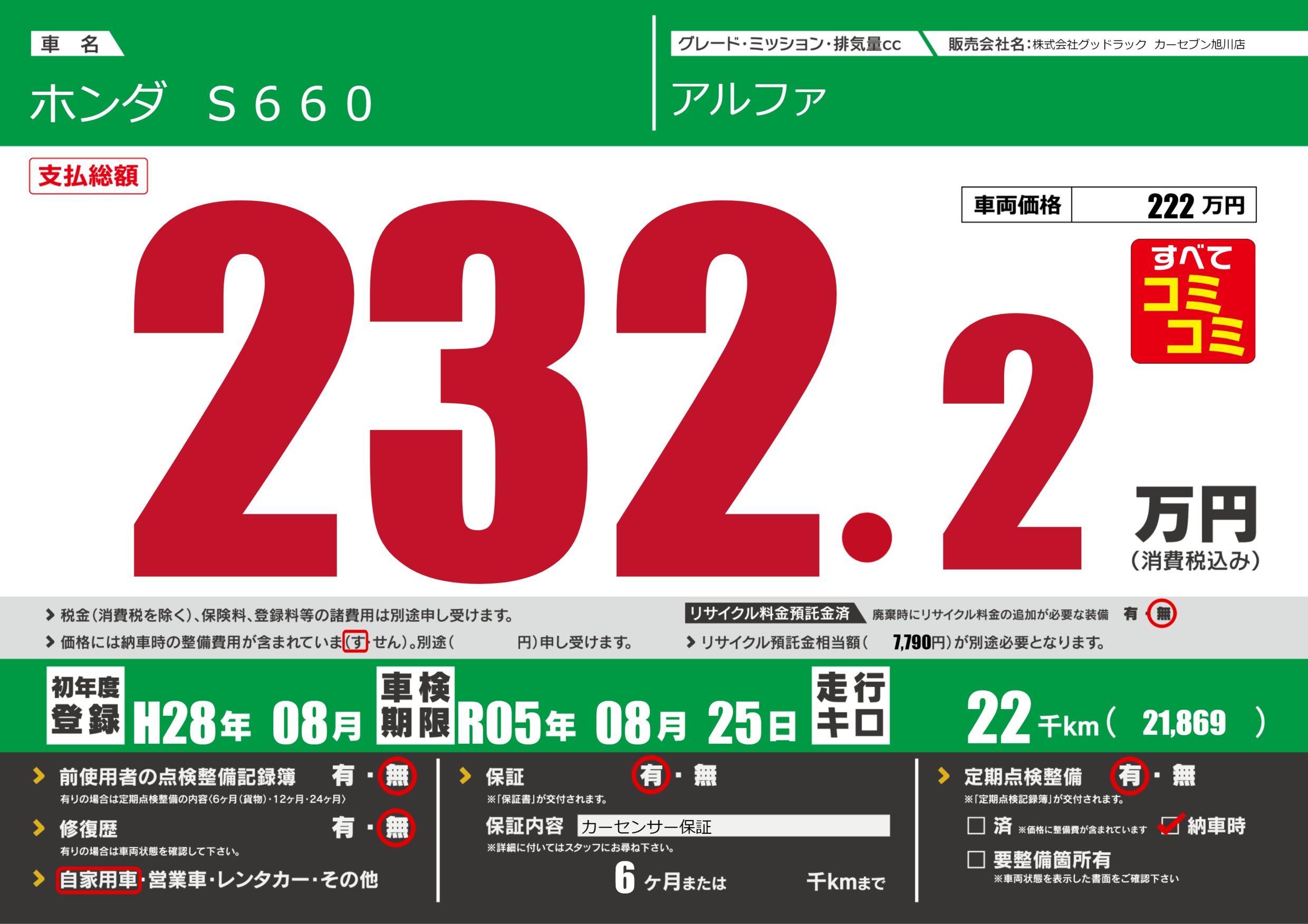 | 車名 | ホンダ S660 | グレード ミッション 排気量 |
