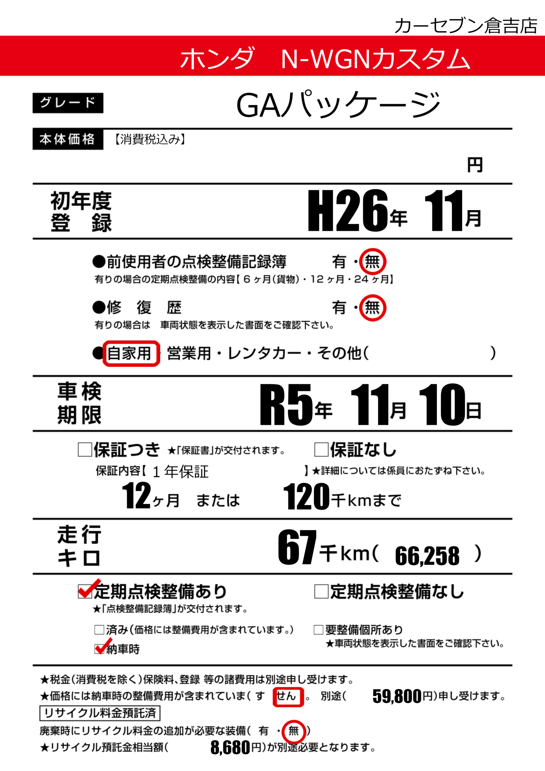 | 車名 | ホンダ N-WGNカスタム | グレード ミッション 排気量 |