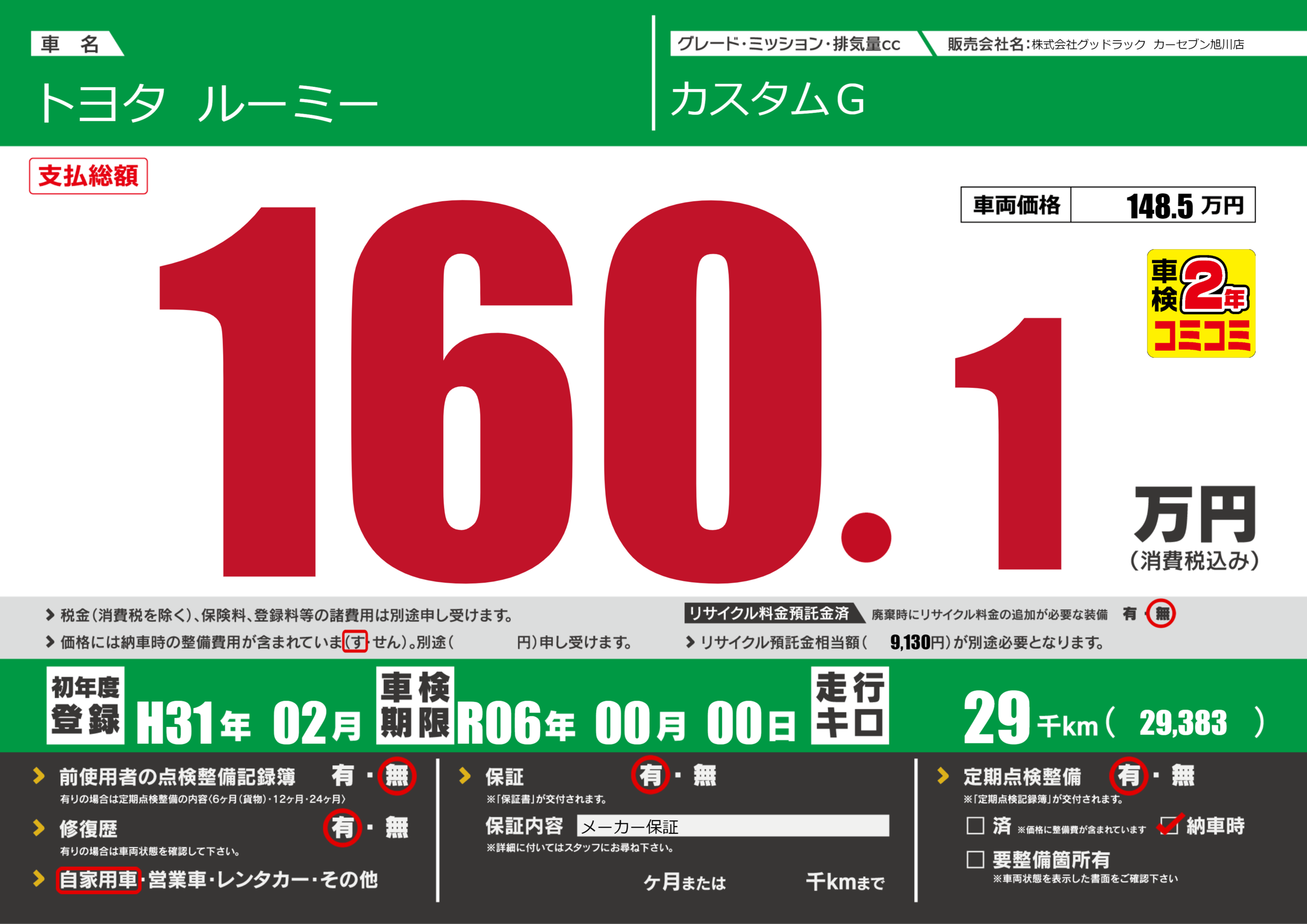 | 車名 | トヨタ ルーミー | グレード ミッション 排気量 |