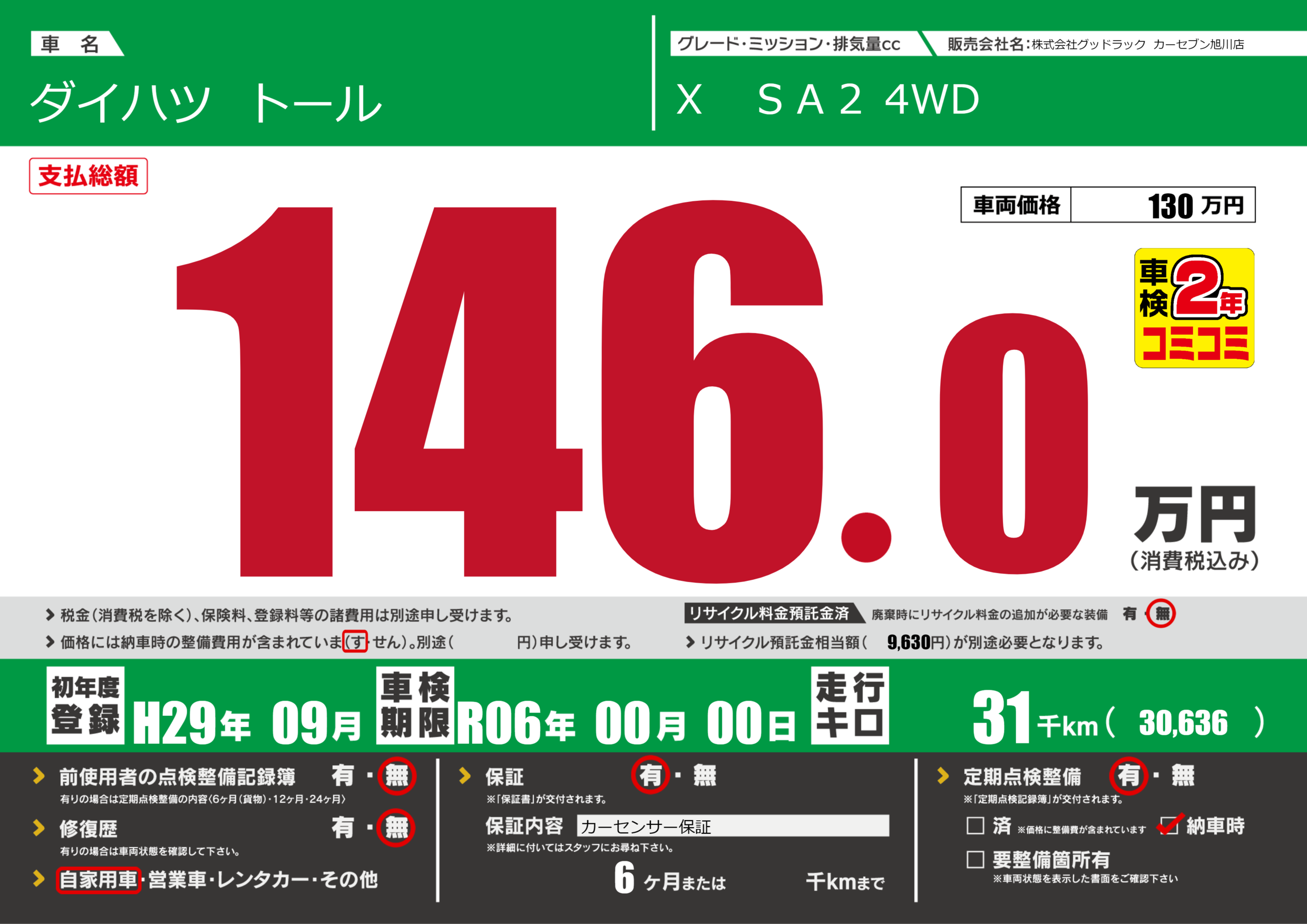 | 走行キロ | 3.1万km | 初年度登録 | H29年09月 |