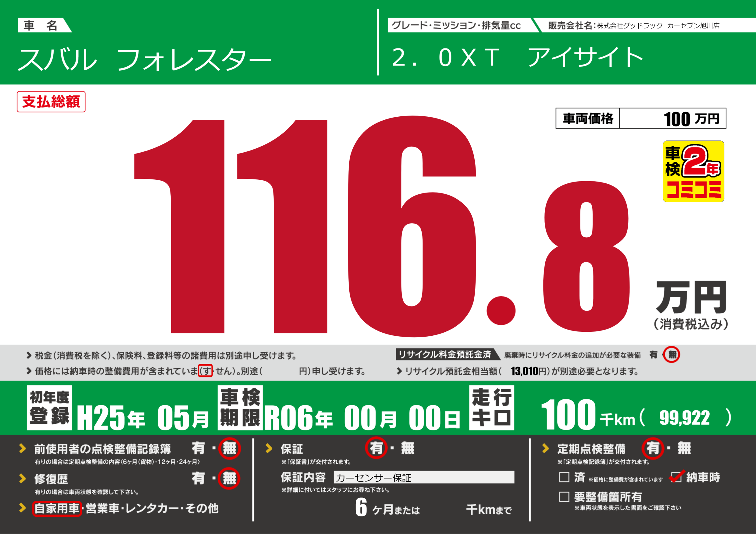 | 車名 | スバル フォレスター | グレード ミッション 排気量 |