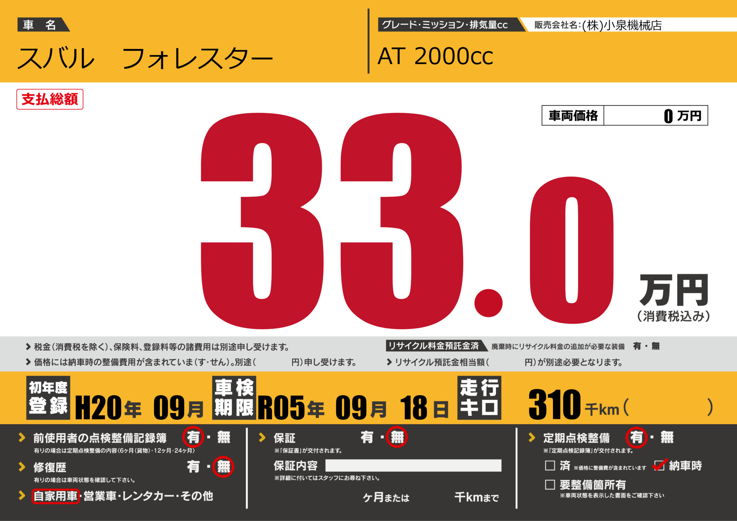 | 走行キロ | 31万km | 初年度登録 | H20年09月 |