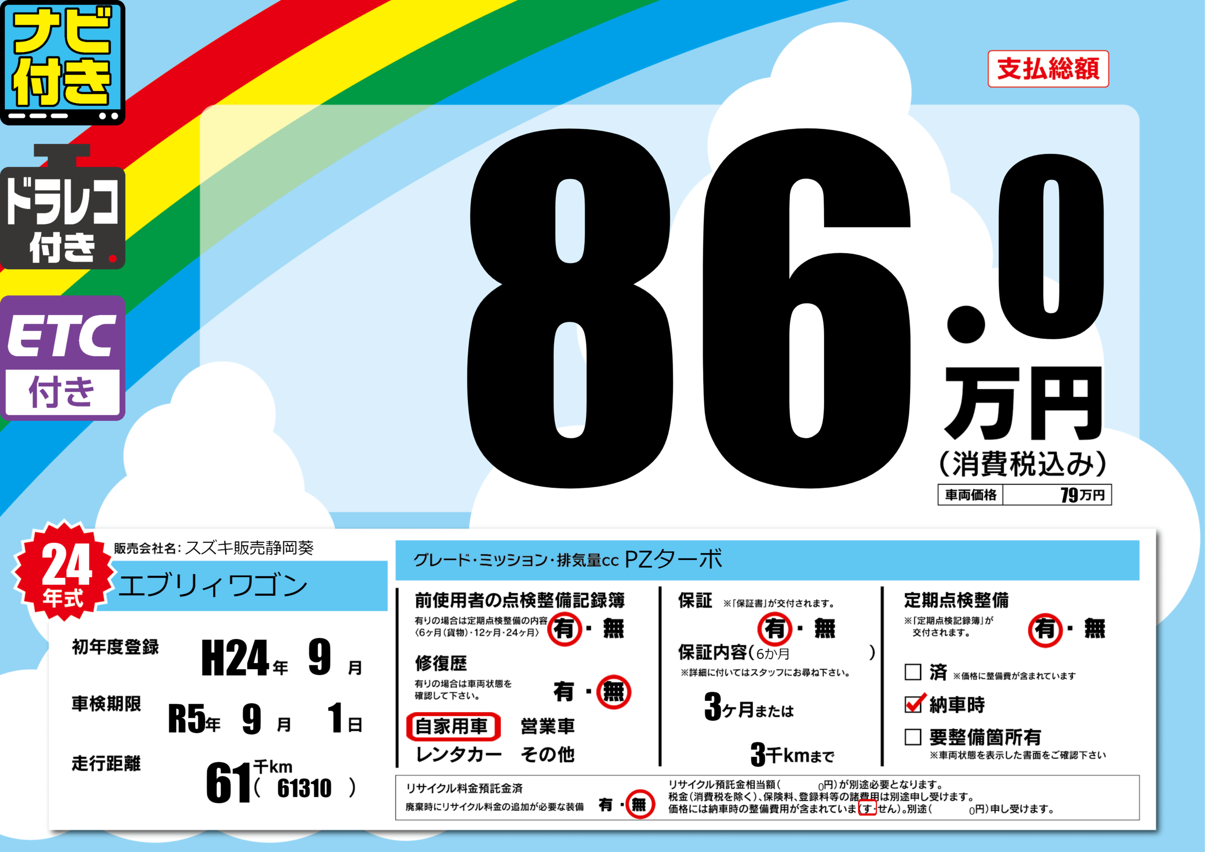 | 車名 | エブリィワゴン | グレード ミッション 排気量 |