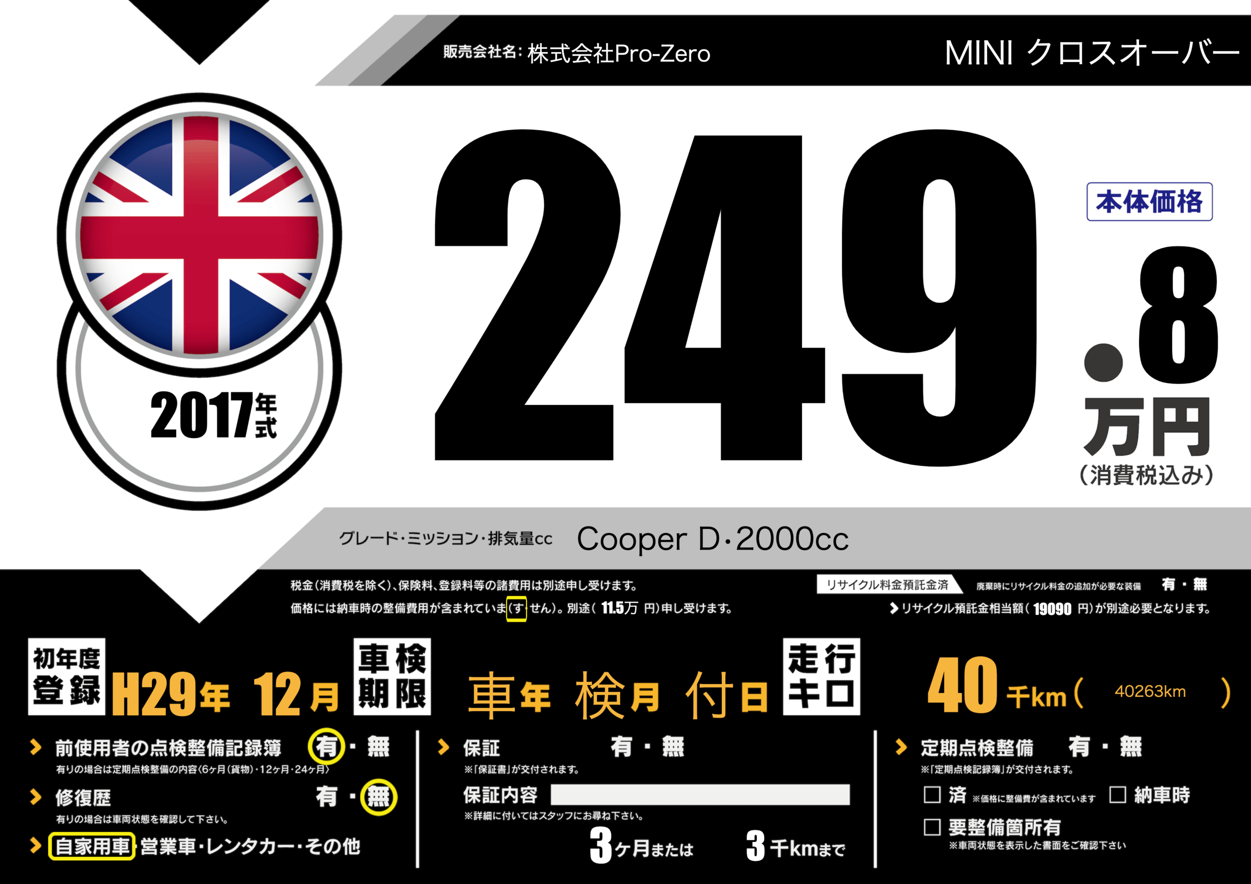 | 車名 | MINI クロスオーバー | グレード ミッション 排気量 |
