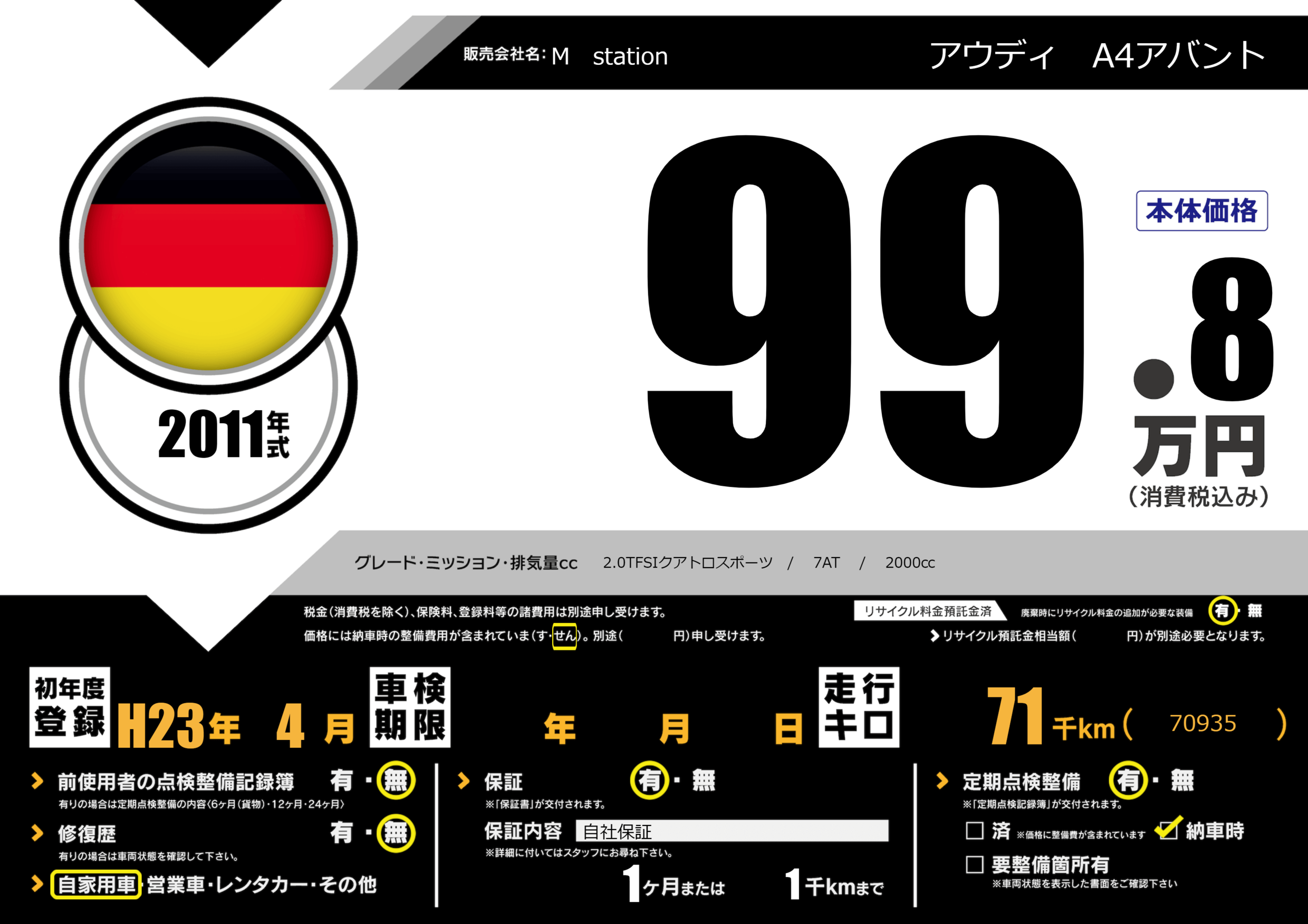 | 車名 | アウディ A4アバント | グレード ミッション 排気量 |