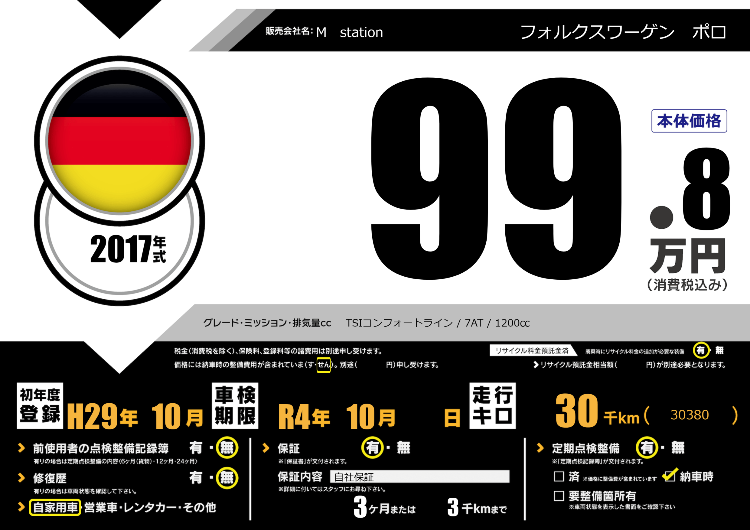 | 走行キロ | 3万km | 初年度登録 | H29年10月 |