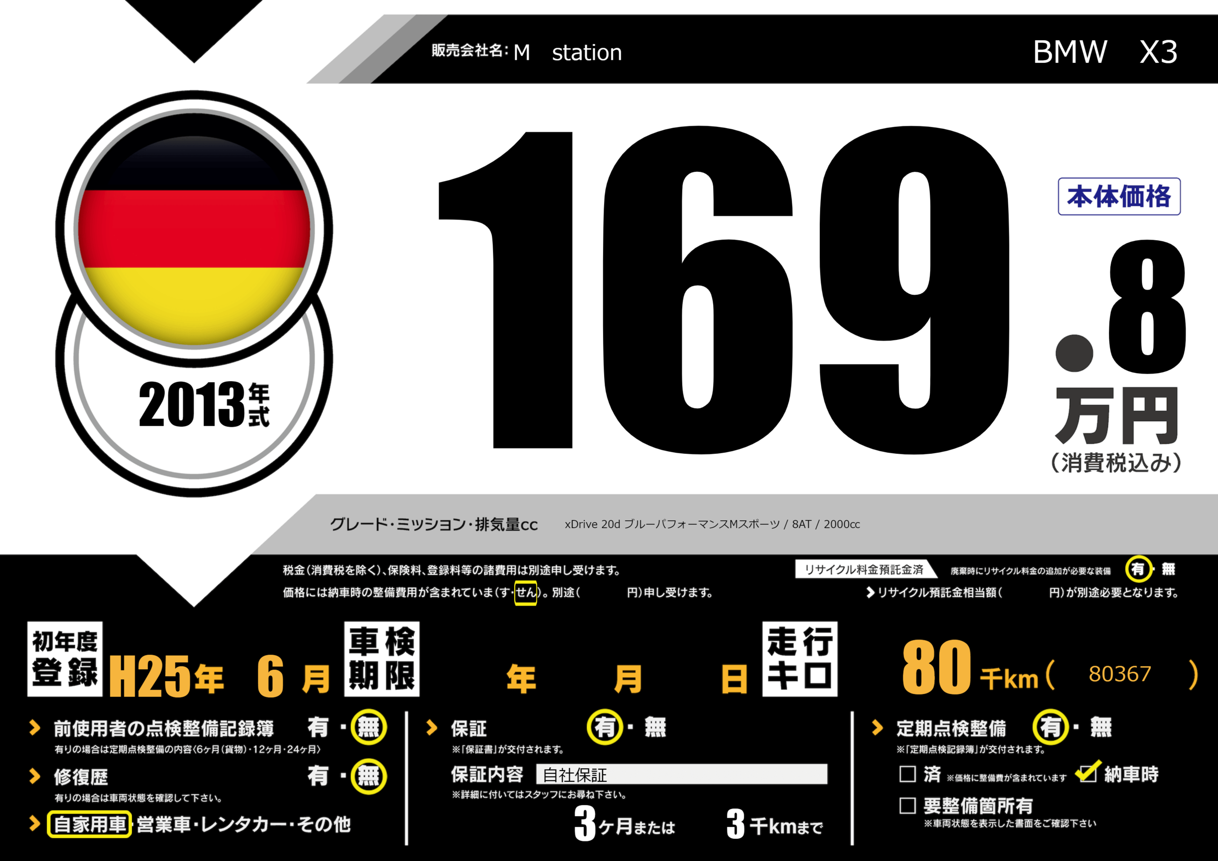 | 車名 | BMW X3 | グレード ミッション 排気量 |
