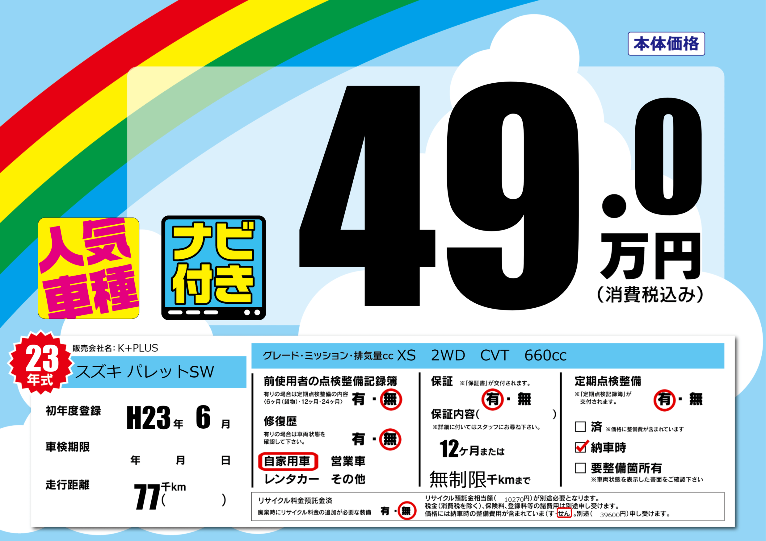| 定期点検整備 | 定期点検整備あり 納車時あり | ||