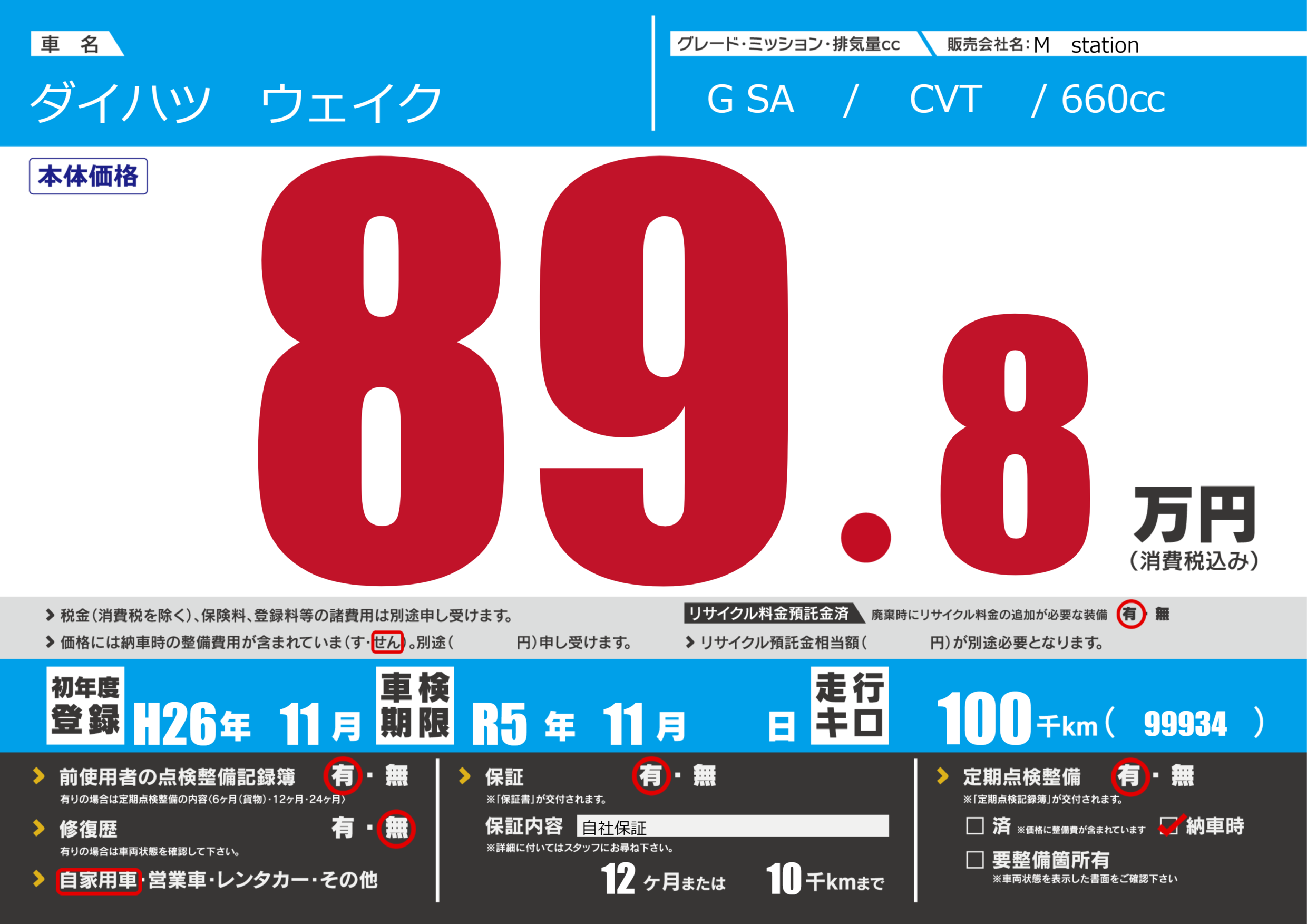 | 定期点検整備 | 定期点検整備あり 納車時あり | ||