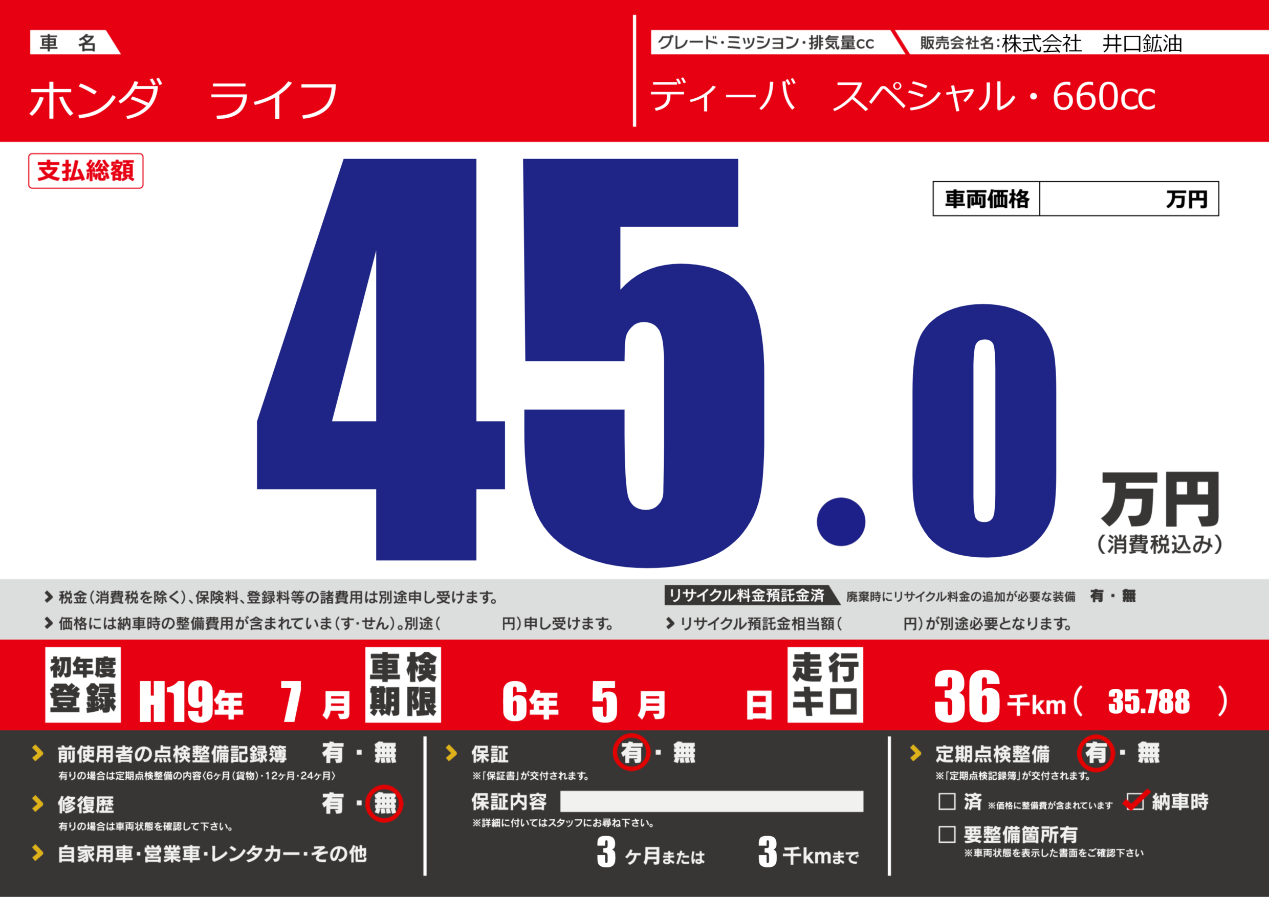 | 車名 | ホンダ ライフ | グレード ミッション 排気量 |