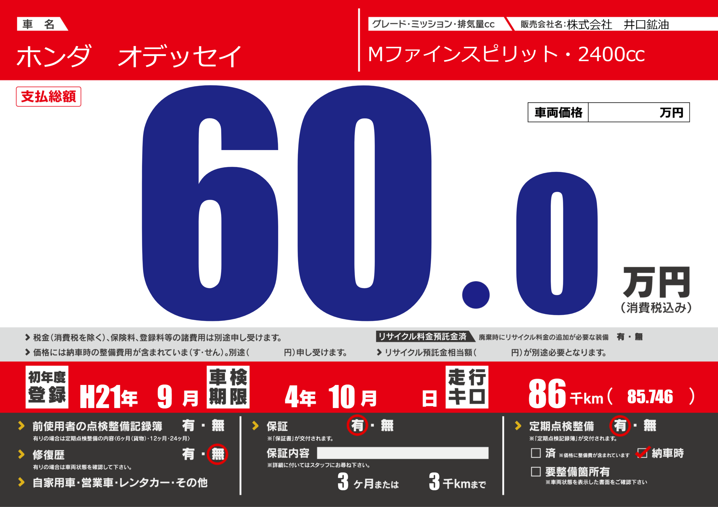 | 走行キロ | 8.6万km | 初年度登録 | H21年9月 |