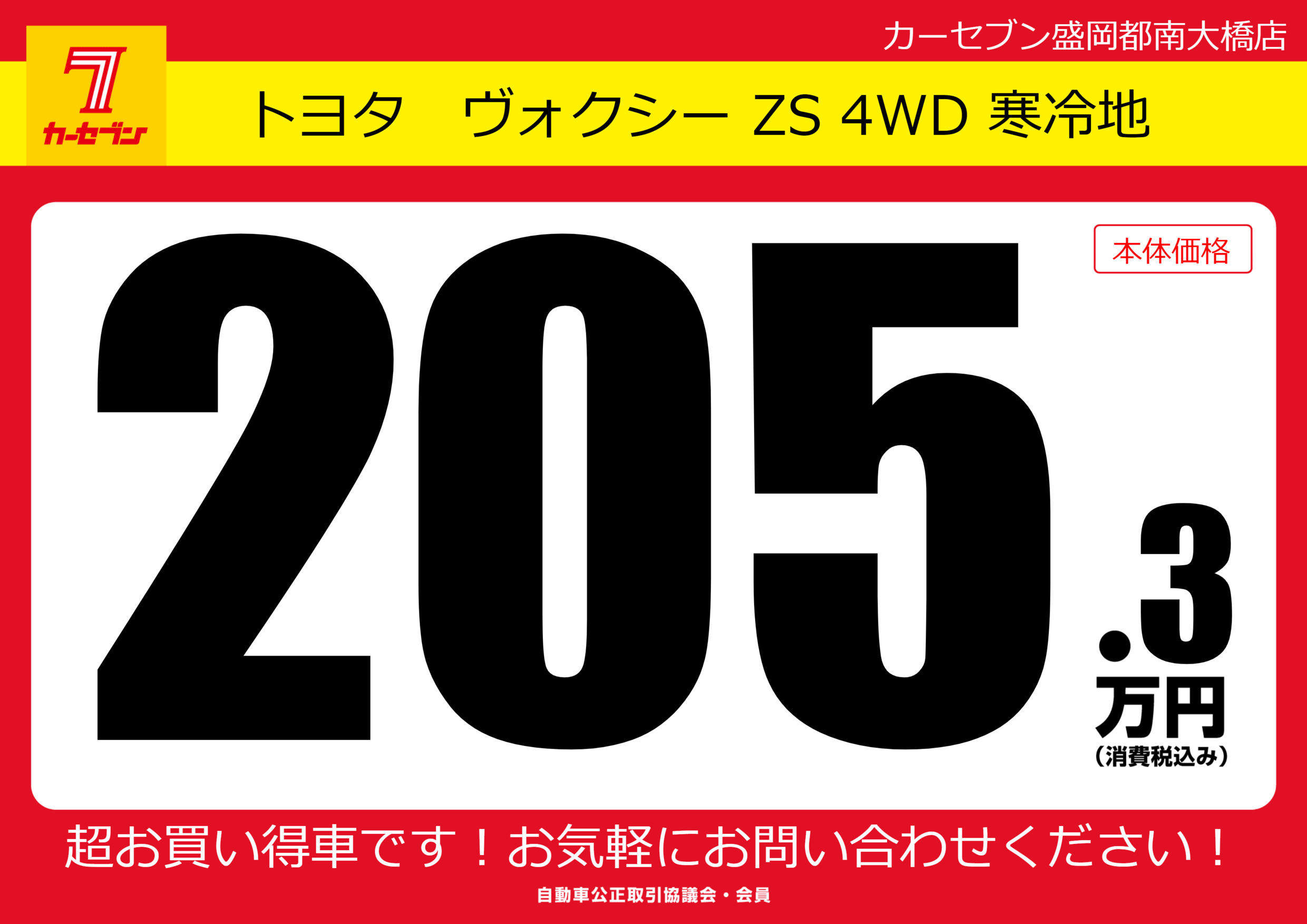 | 車名 | トヨタ ヴォクシー ZS 4WD 寒冷地 | グレード ミッション 排気量 |