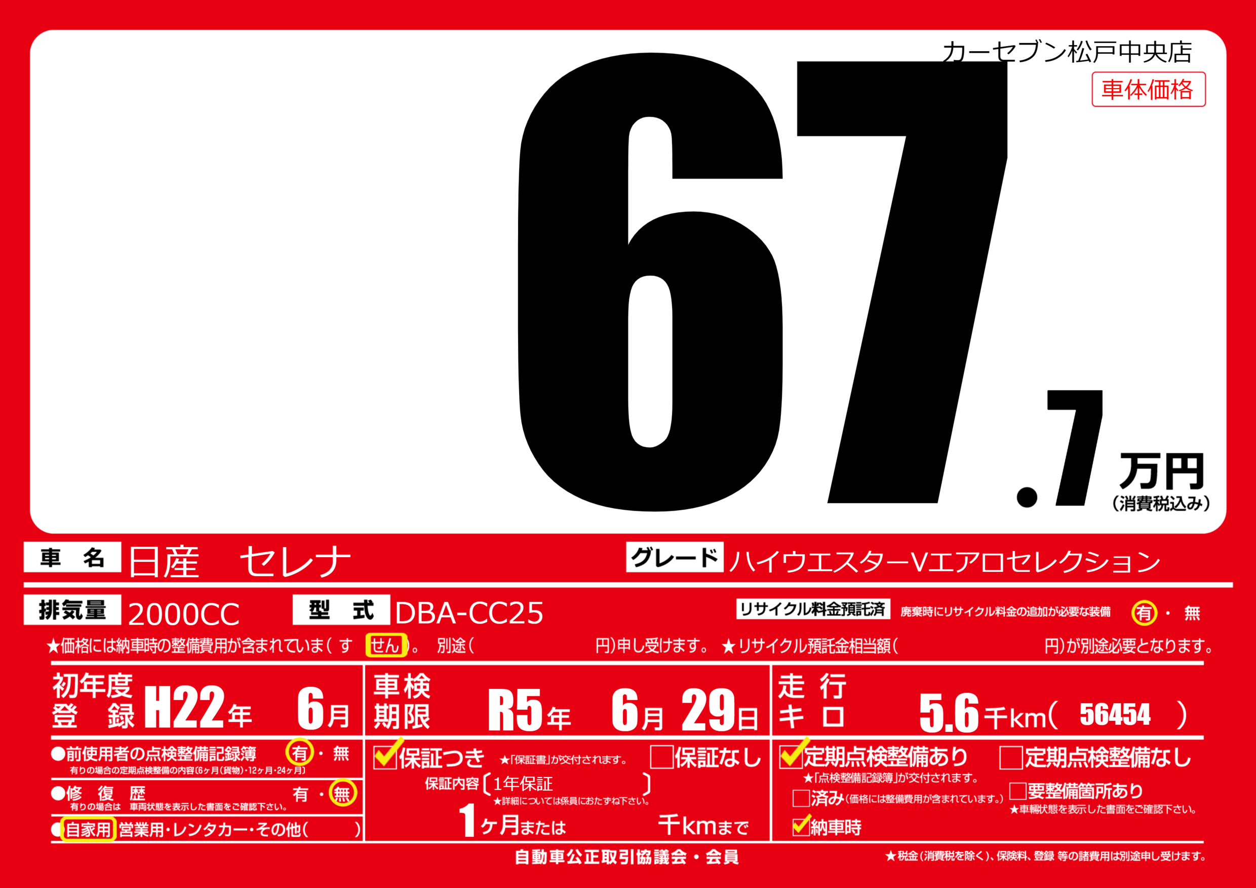 | 車名 | 日産 セレナ | グレード ミッション 排気量 |