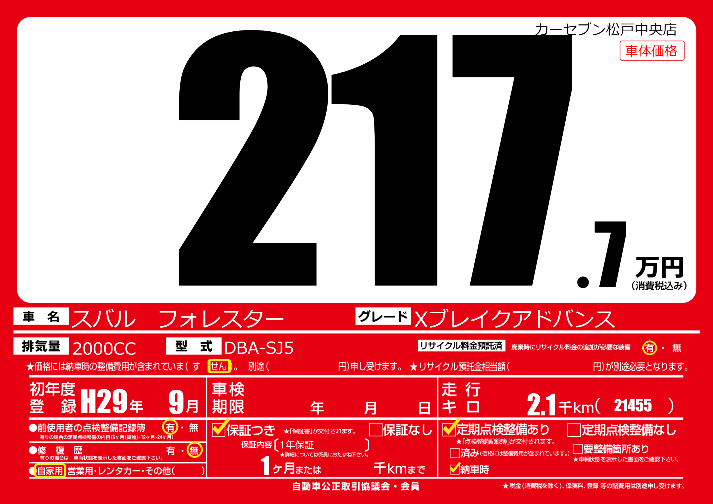 | 車名 | スバル フォレスター | グレード ミッション 排気量 |