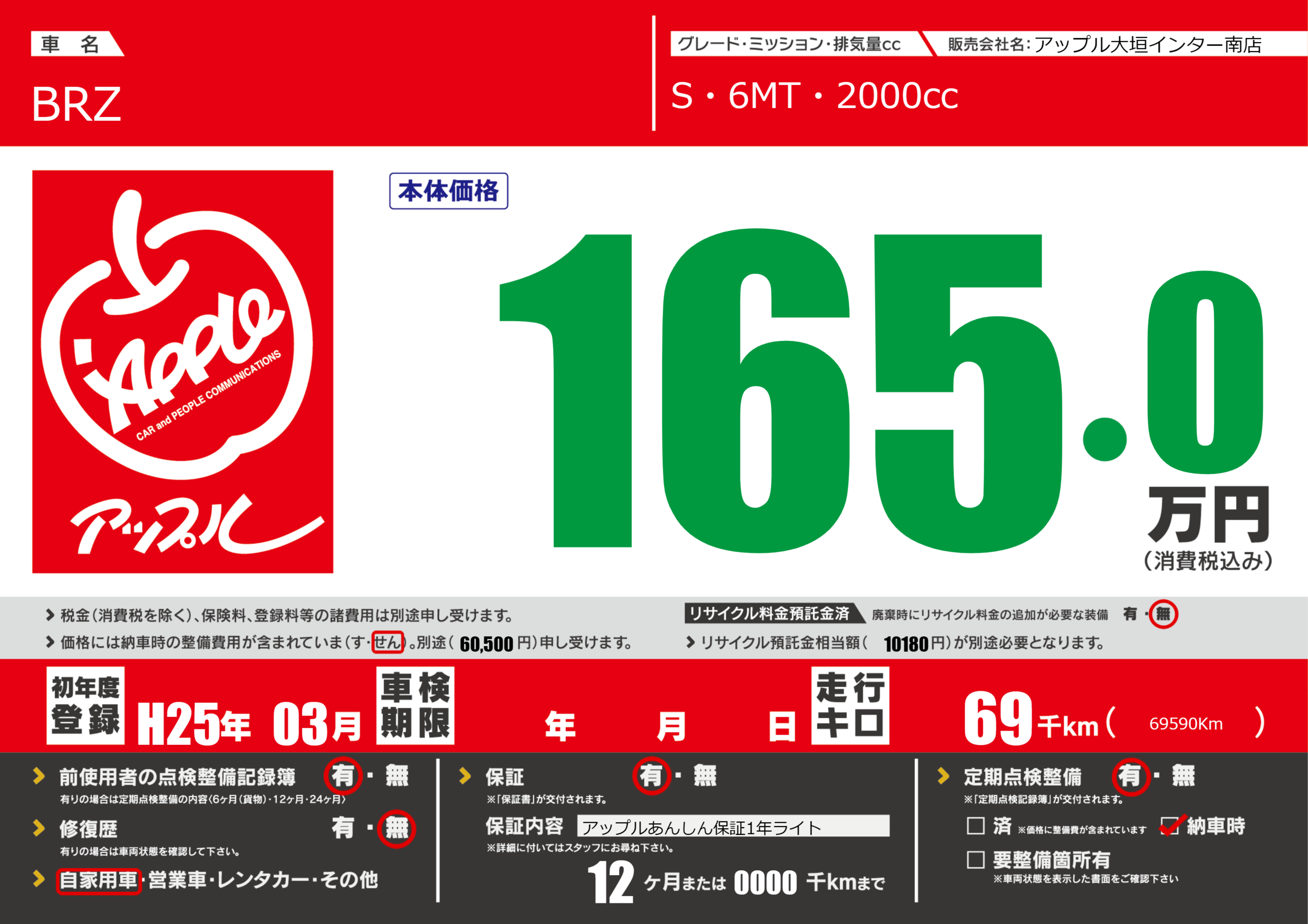 | 車名 | BRZ | グレード ミッション 排気量 |