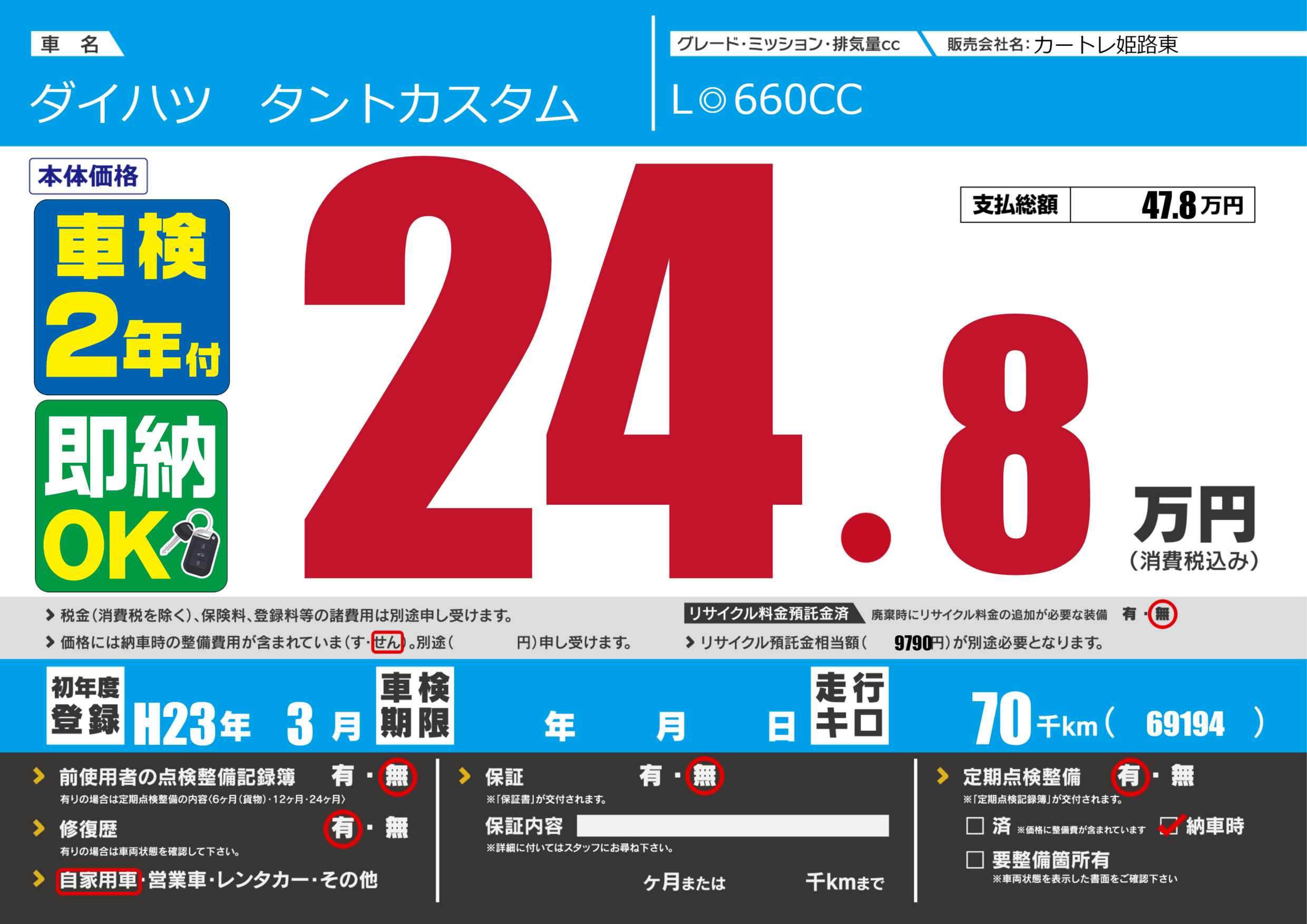 | 走行キロ | 7万km | 初年度登録 | H23年3月 |