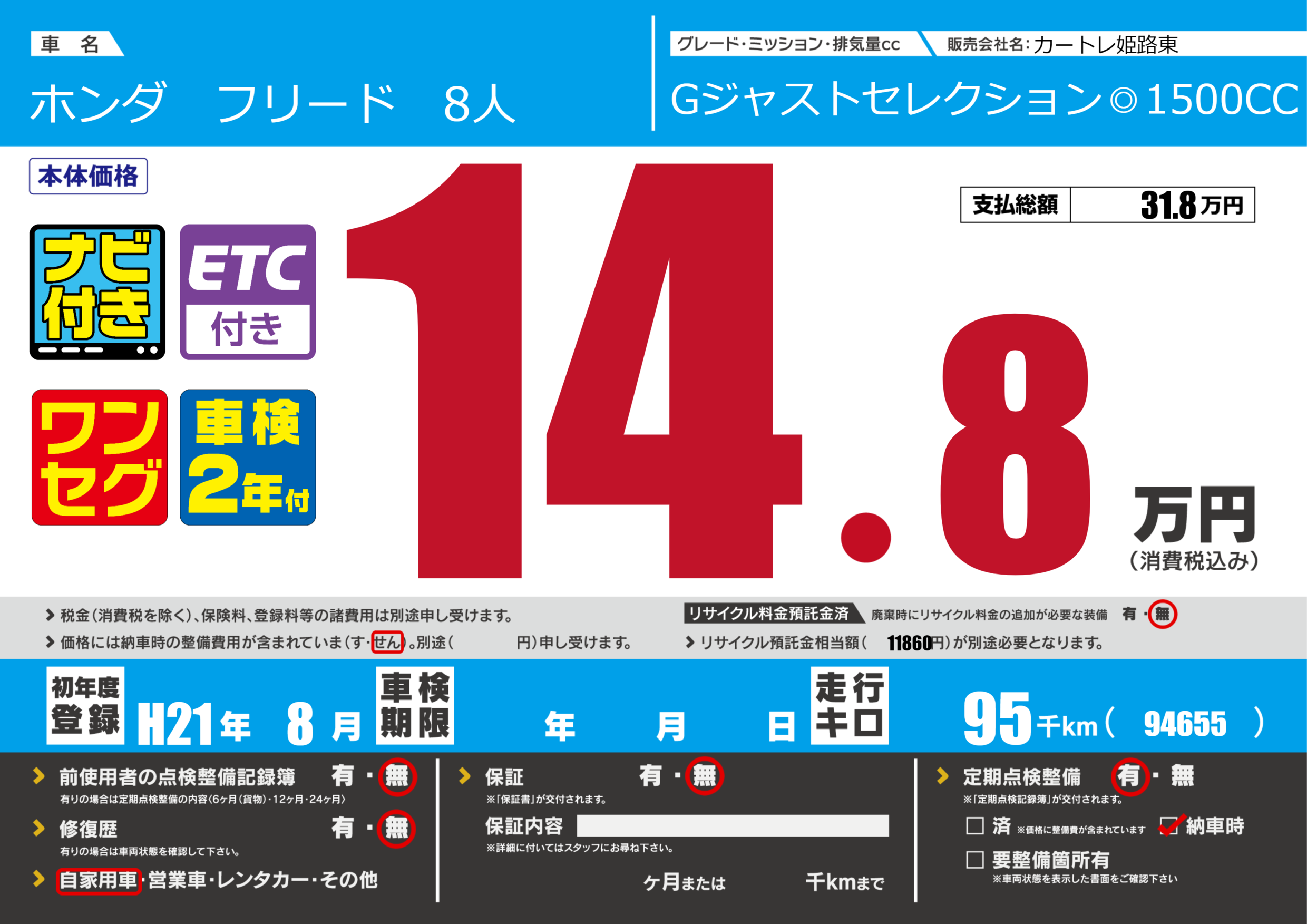 | 車名 | ホンダ フリード 8人 | グレード ミッション 排気量 |