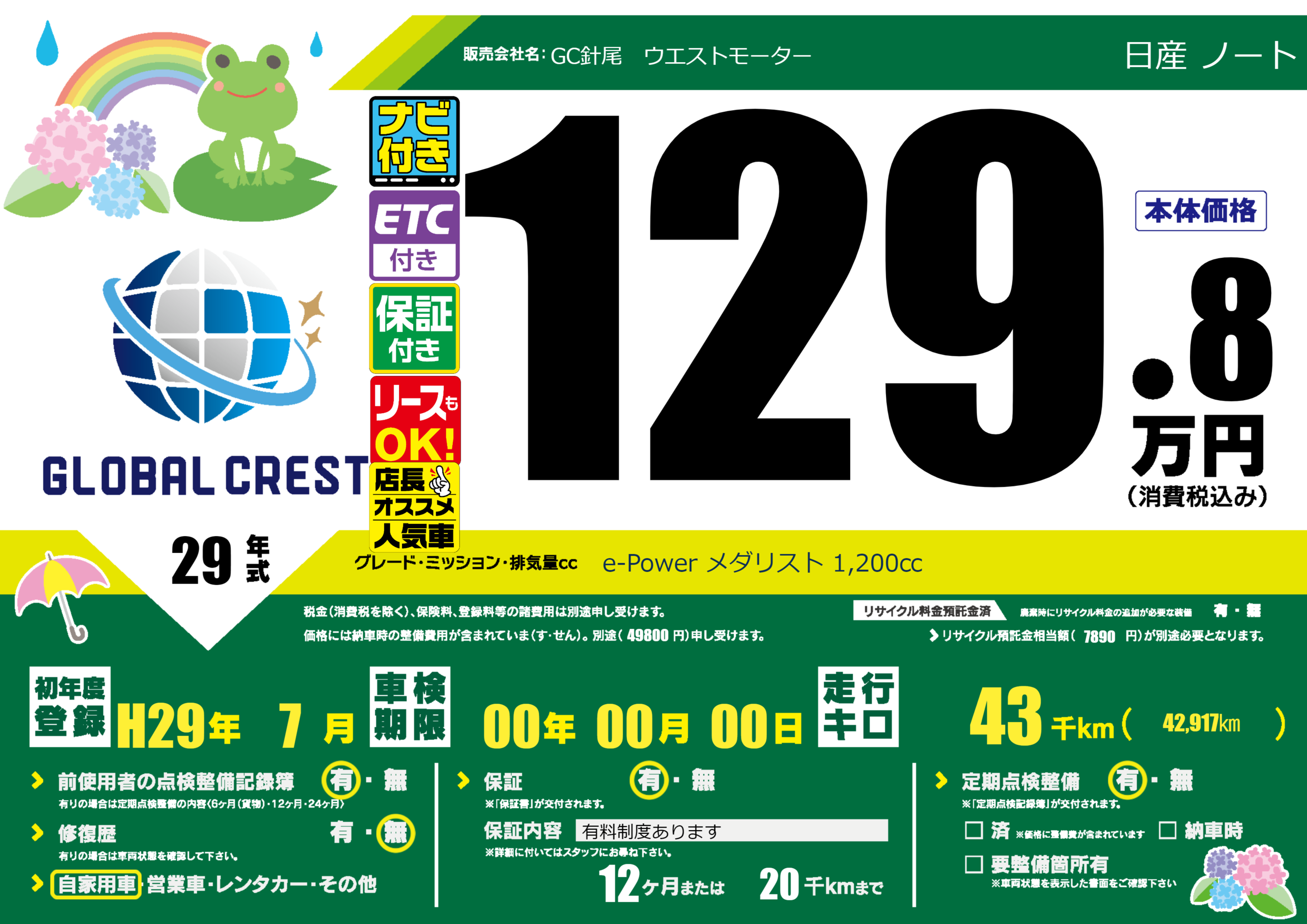 | 車名 | 日産 ノート | グレード ミッション 排気量 |