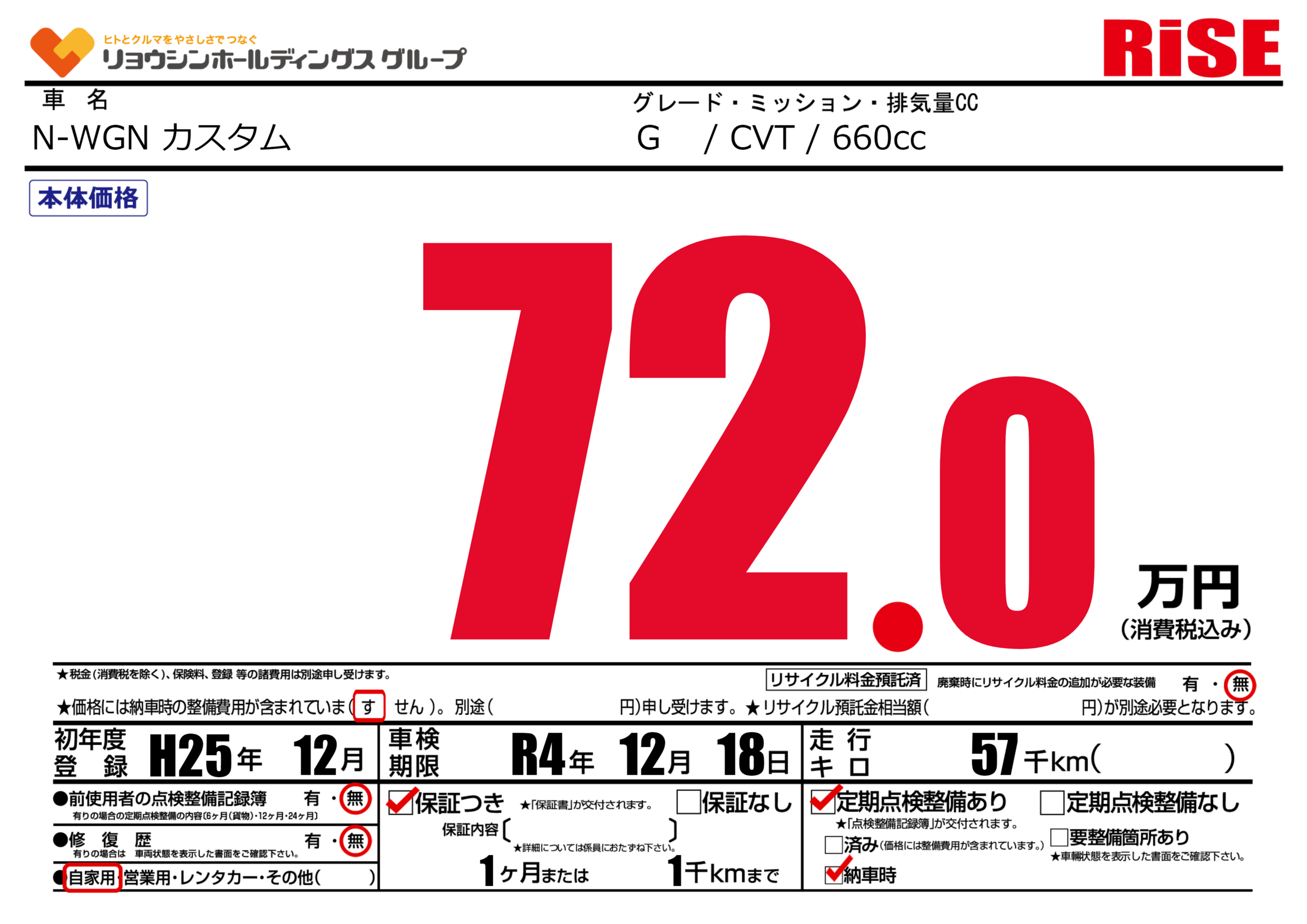 | 車名 | N-WGN カスタム | グレード ミッション 排気量 |