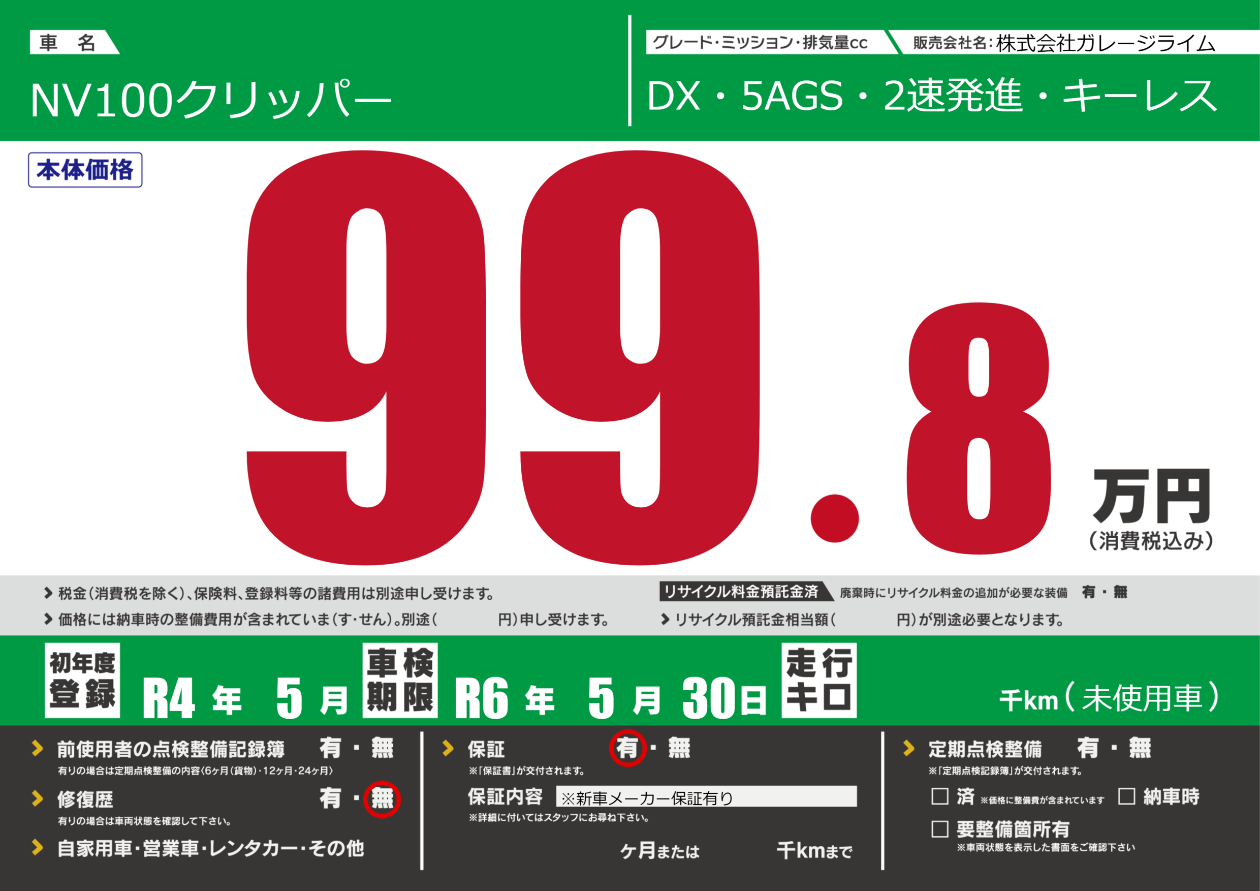 | 車名 | NV100クリッパー | グレード ミッション 排気量 |