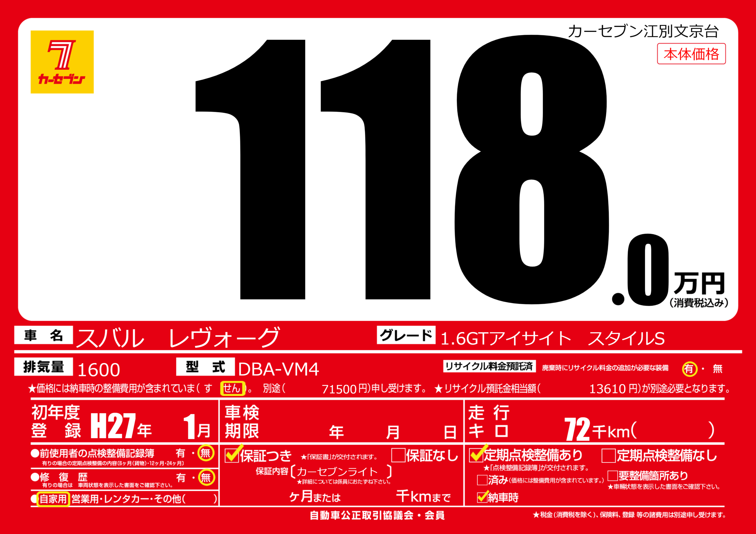 | 車名 | スバル レヴォーグ | グレード ミッション 排気量 |