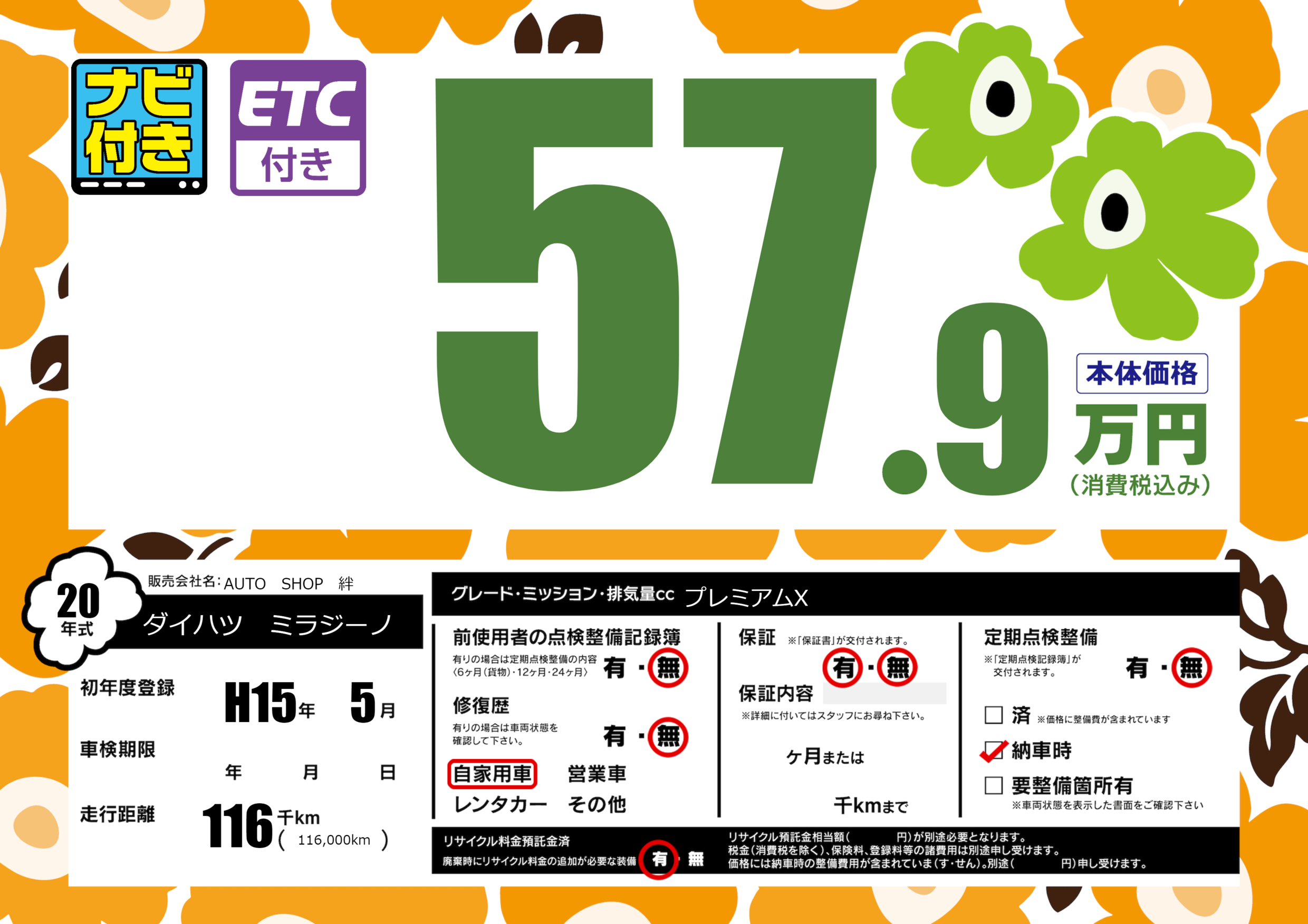| 走行キロ | 11.6万km | 初年度登録 | H15年5月 |