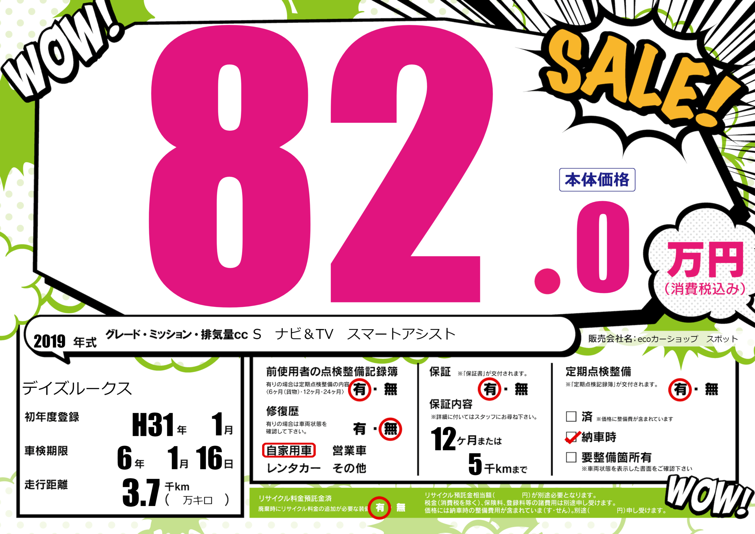 | 走行キロ | 0.3万km | 初年度登録 | H31年1月 |