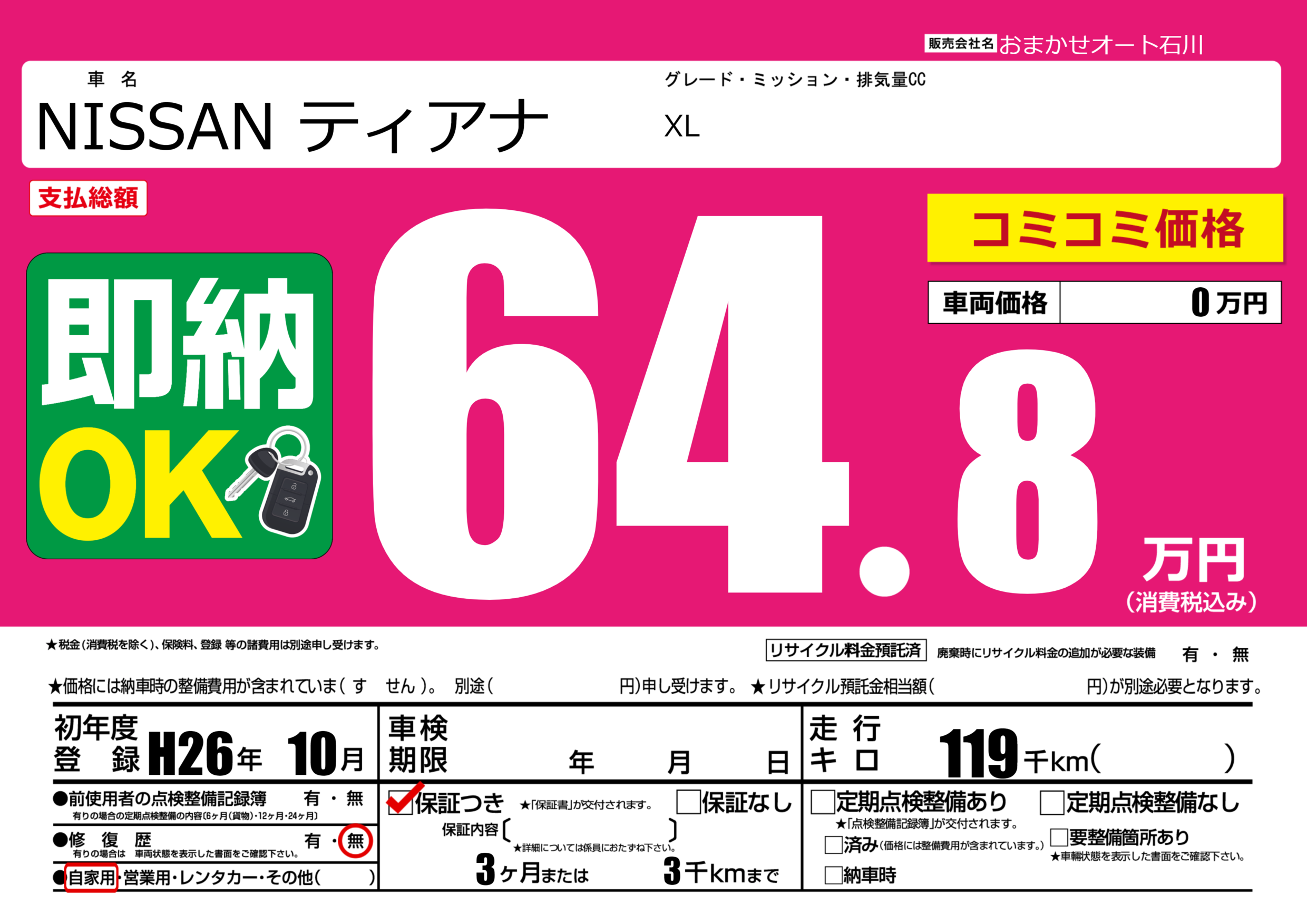 | 車名 | NISSAN ティアナ | グレード ミッション 排気量 |
