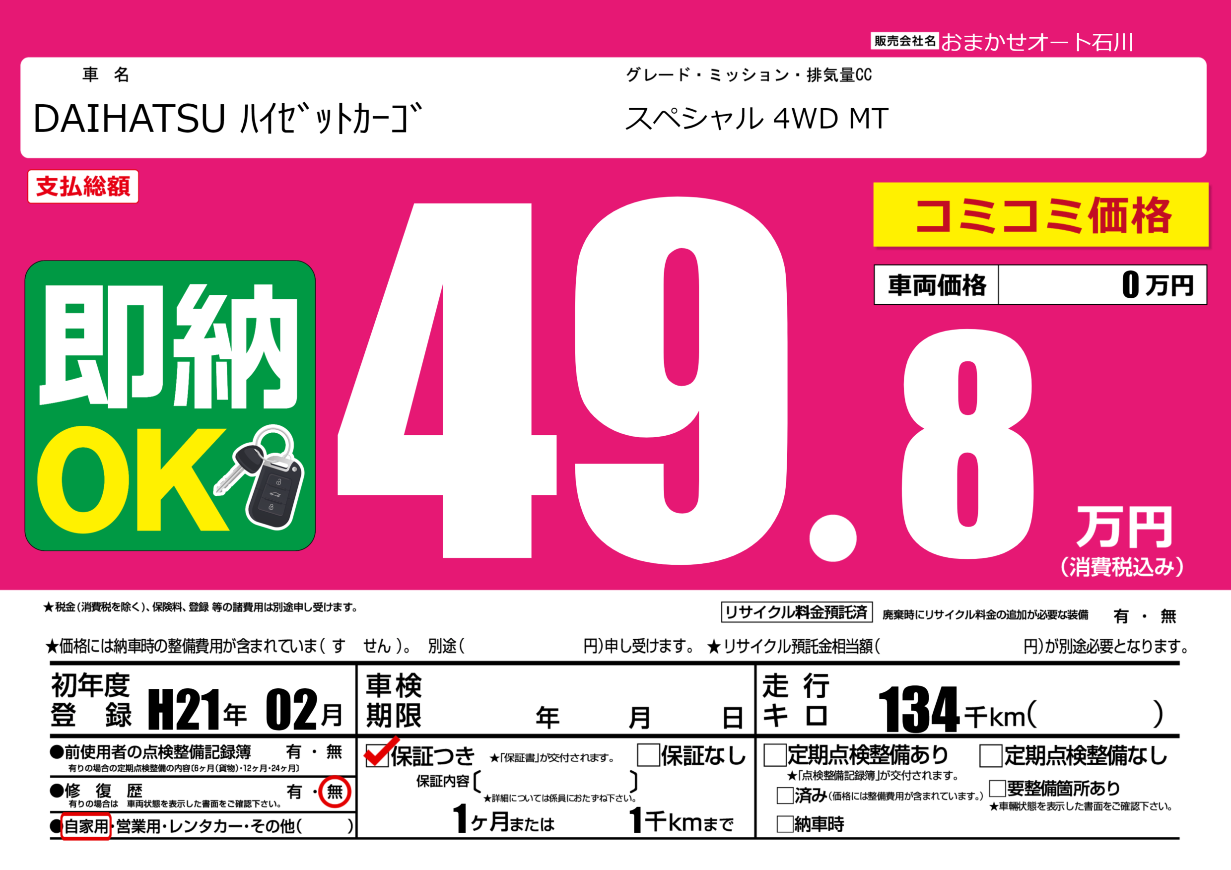 | 車名 | DAIHATSU ハイゼットカーゴ | グレード ミッション 排気量 |