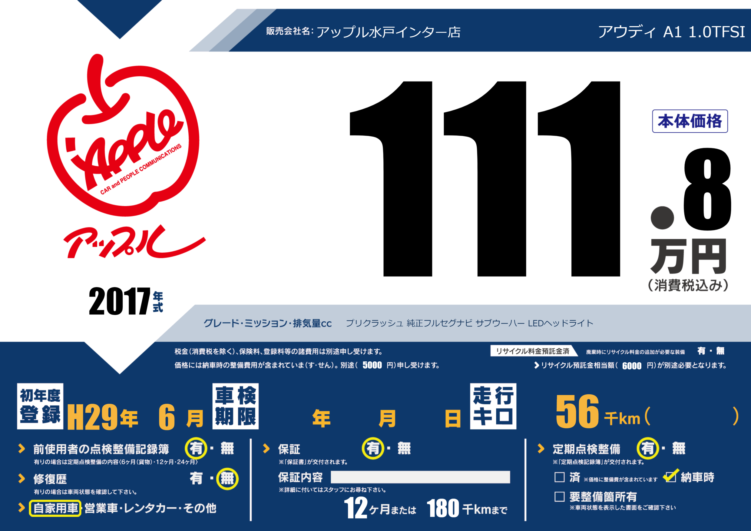 | 車名 | アウディ A1 1.0TFSI | グレード ミッション 排気量 |