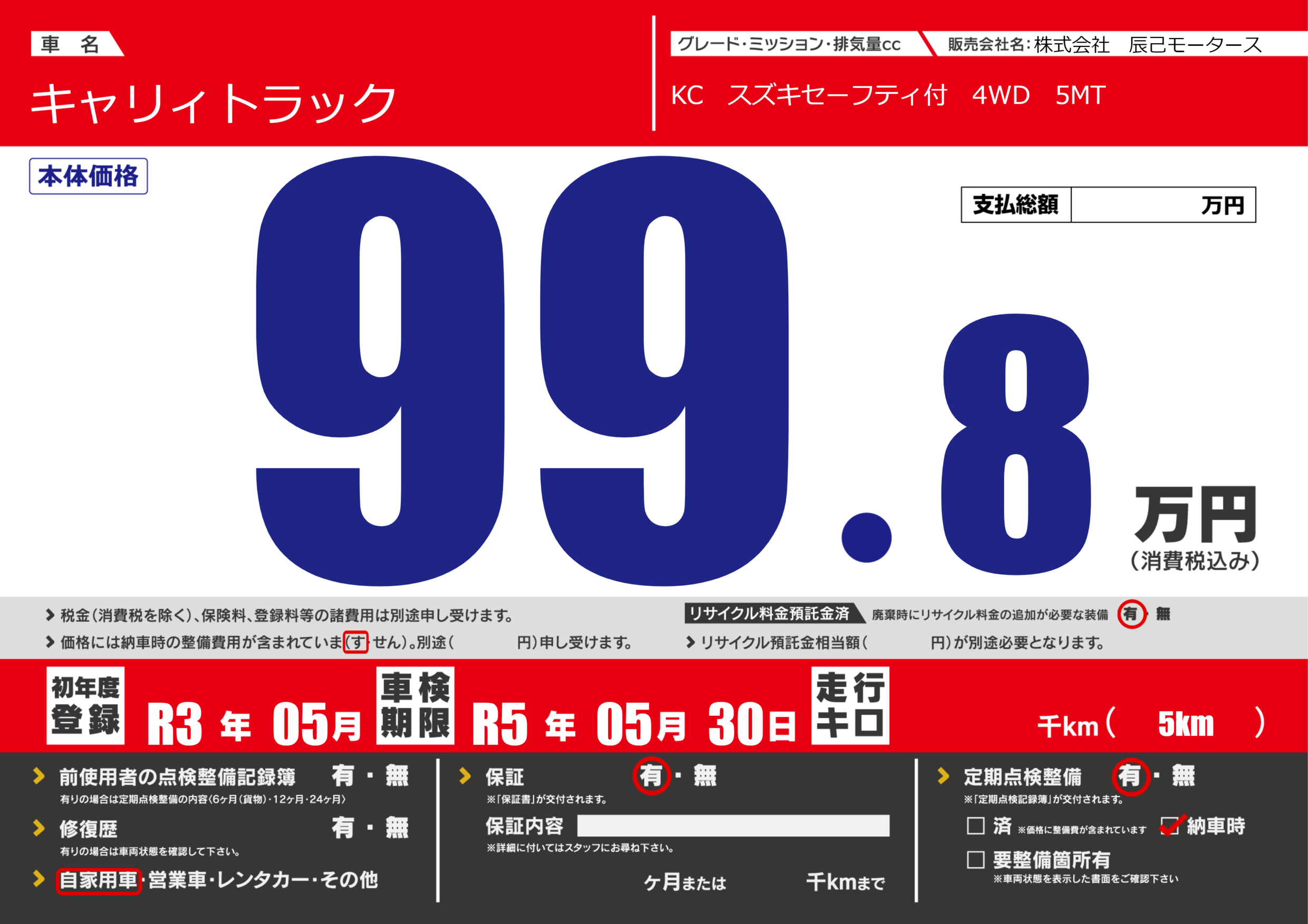 | 走行キロ | - | 初年度登録 | R3年05月 |