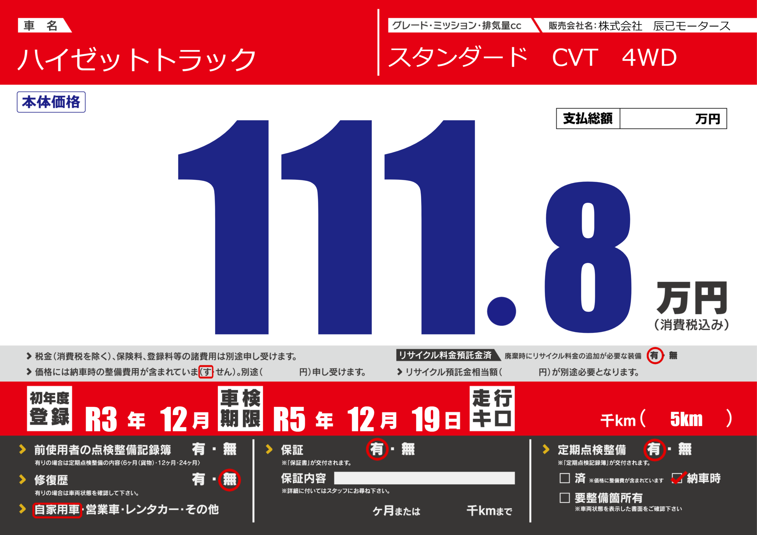 | 走行キロ | - | 初年度登録 | R3年12月 |