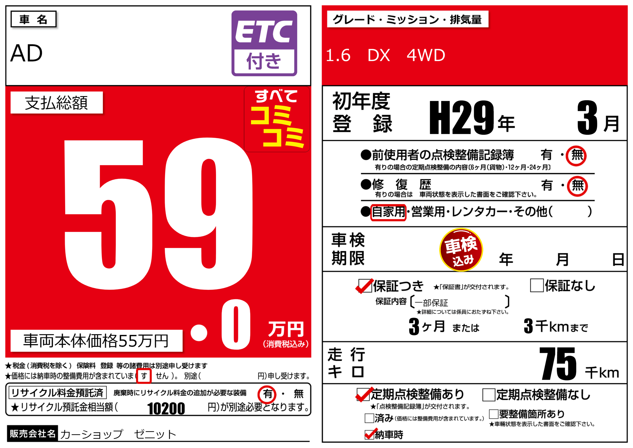 | 定期点検整備 | 定期点検整備あり 納車時あり | ||