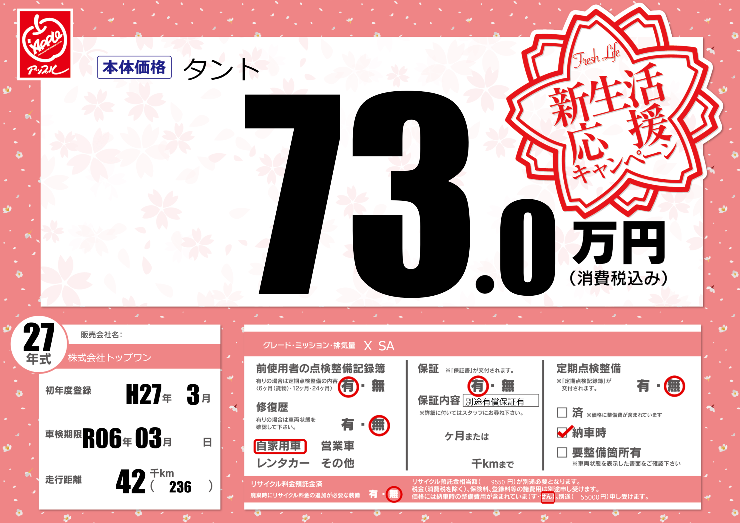 | 走行キロ | 4.2万km | 初年度登録 | H27年3月 |